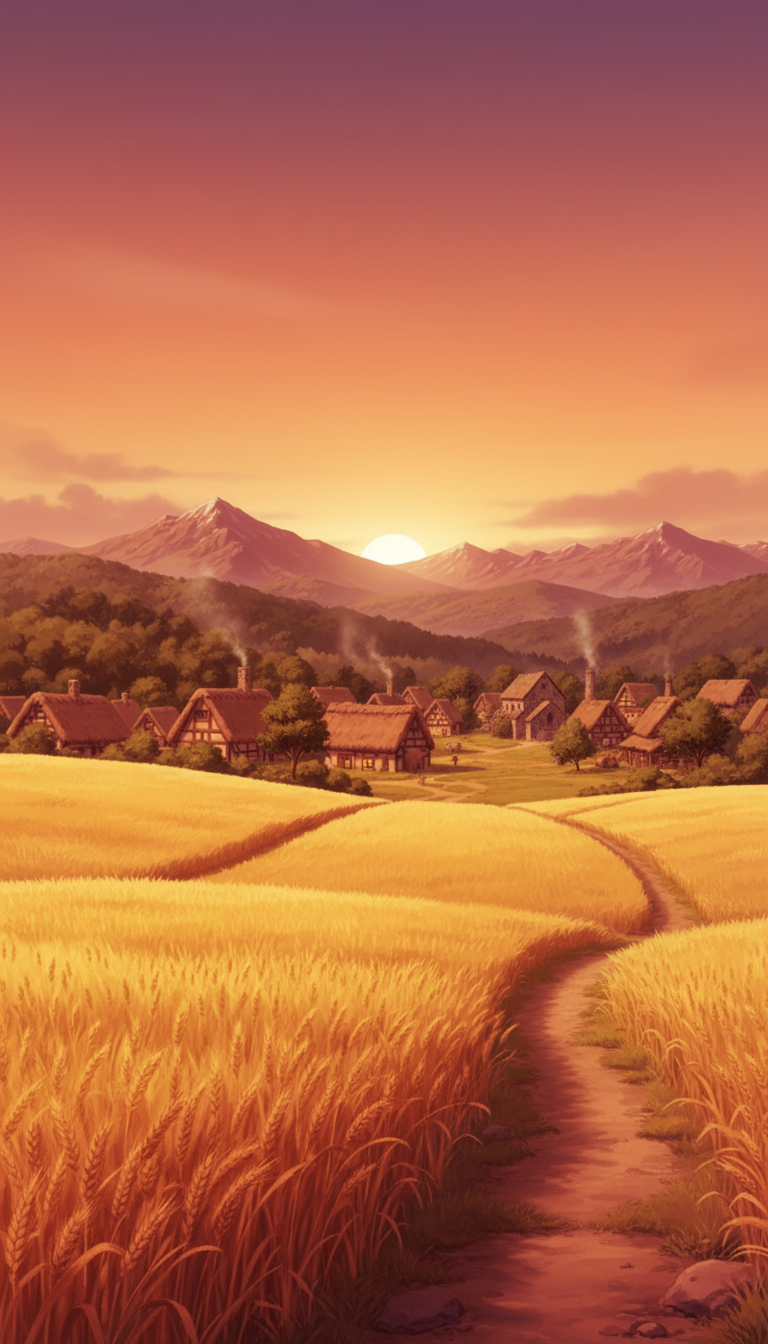沈む夕日が小麦畑と村を赤金色に染める、感情豊かなクライマックスシーン向け背景です。