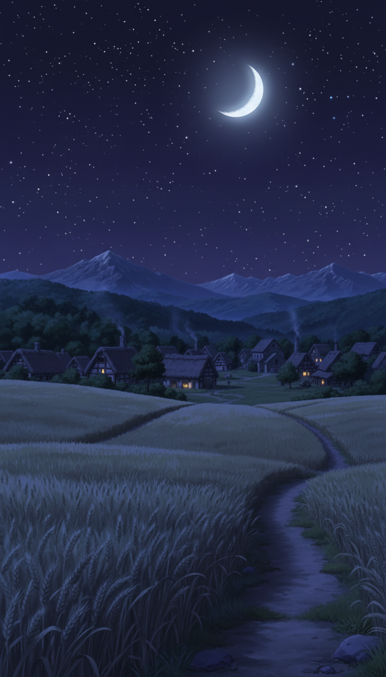 満天の星と三日月の下、小麦畑の間を村へ続く道が伸びる静かな夜のフィールド背景です。