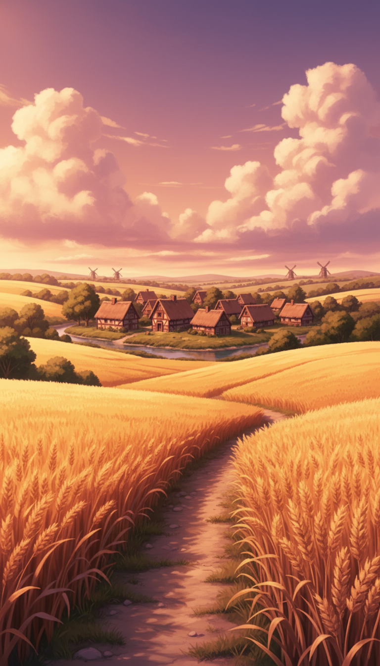 夕焼け色の雲と風車を背に、小麦畑と村が温かな光に包まれるノスタルジックな背景です。