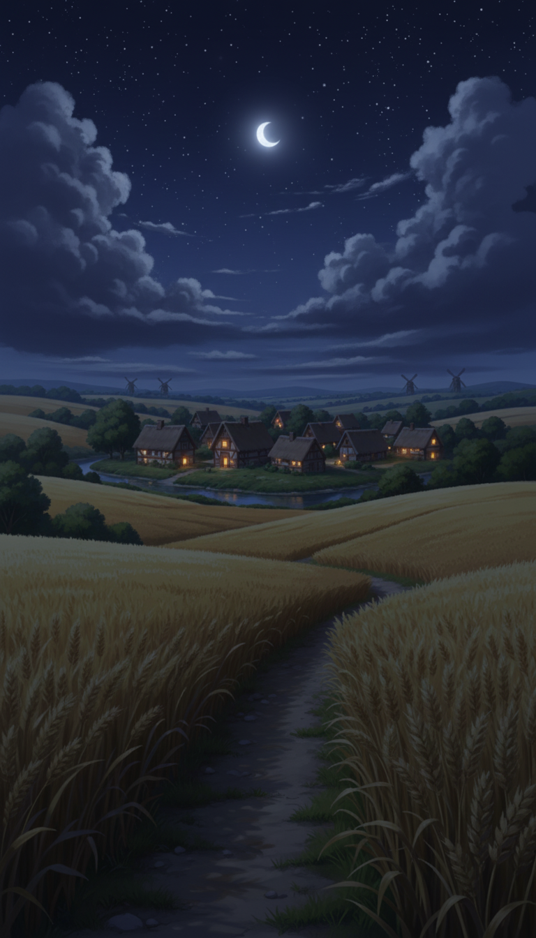 雲間の星と三日月に照らされ、麦畑と風車村の灯りがほのかに浮かぶ夜の背景です。