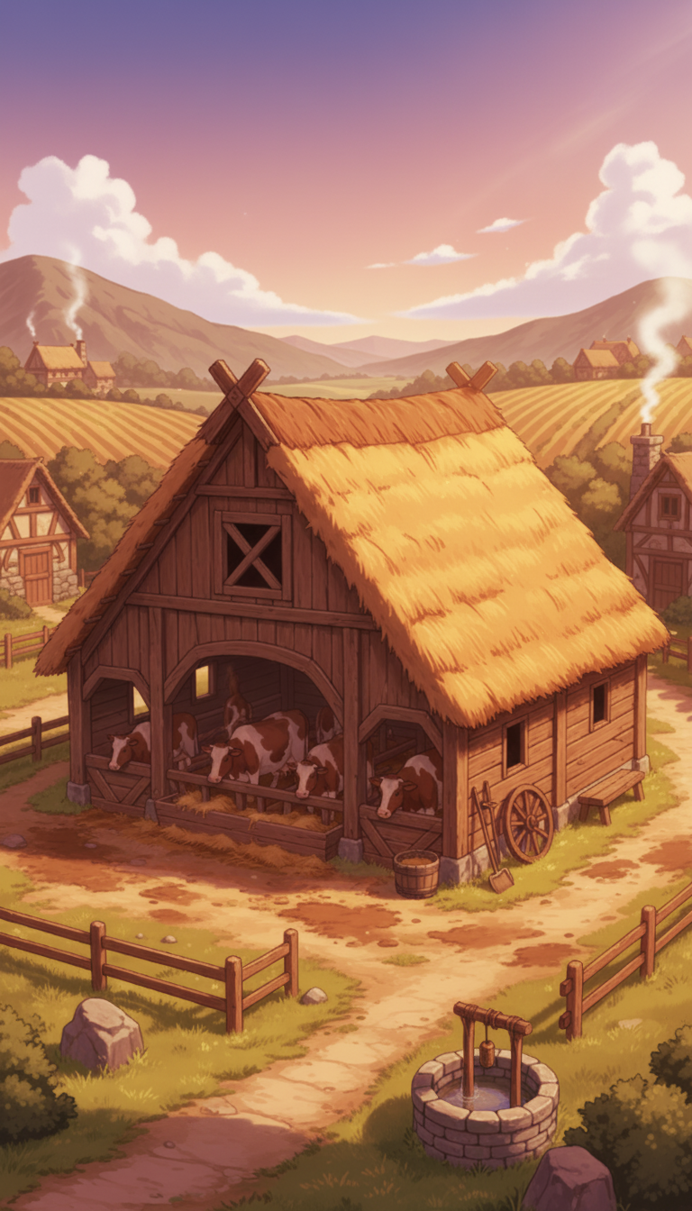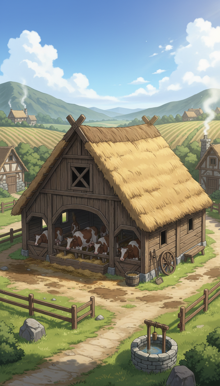 牛たちが並ぶ木造牛舎と畑や丘が広がる、牧歌的な中世ファンタジー農場の背景です。