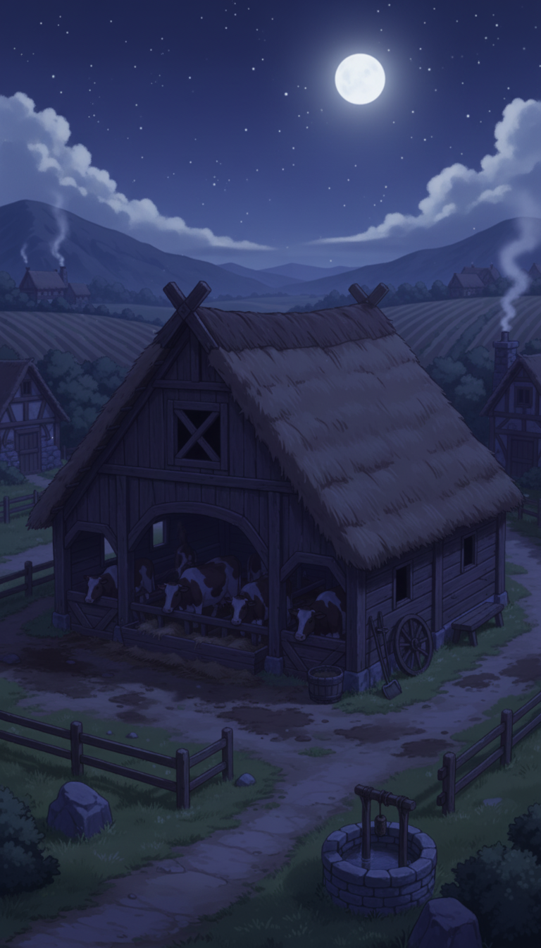 月光の牛舎と畑|中世ファンタジー農場夜景
