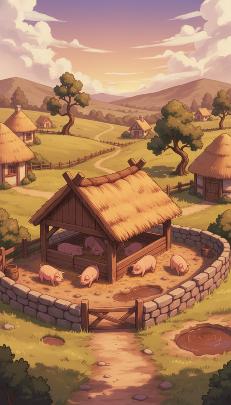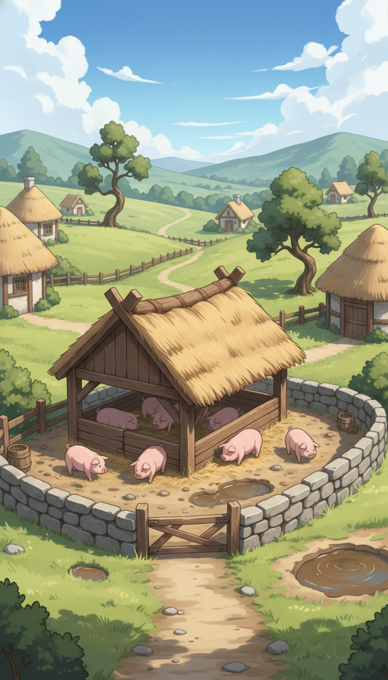 丘の上の豚小屋と農村風景|中世ファンタジー牧場背景