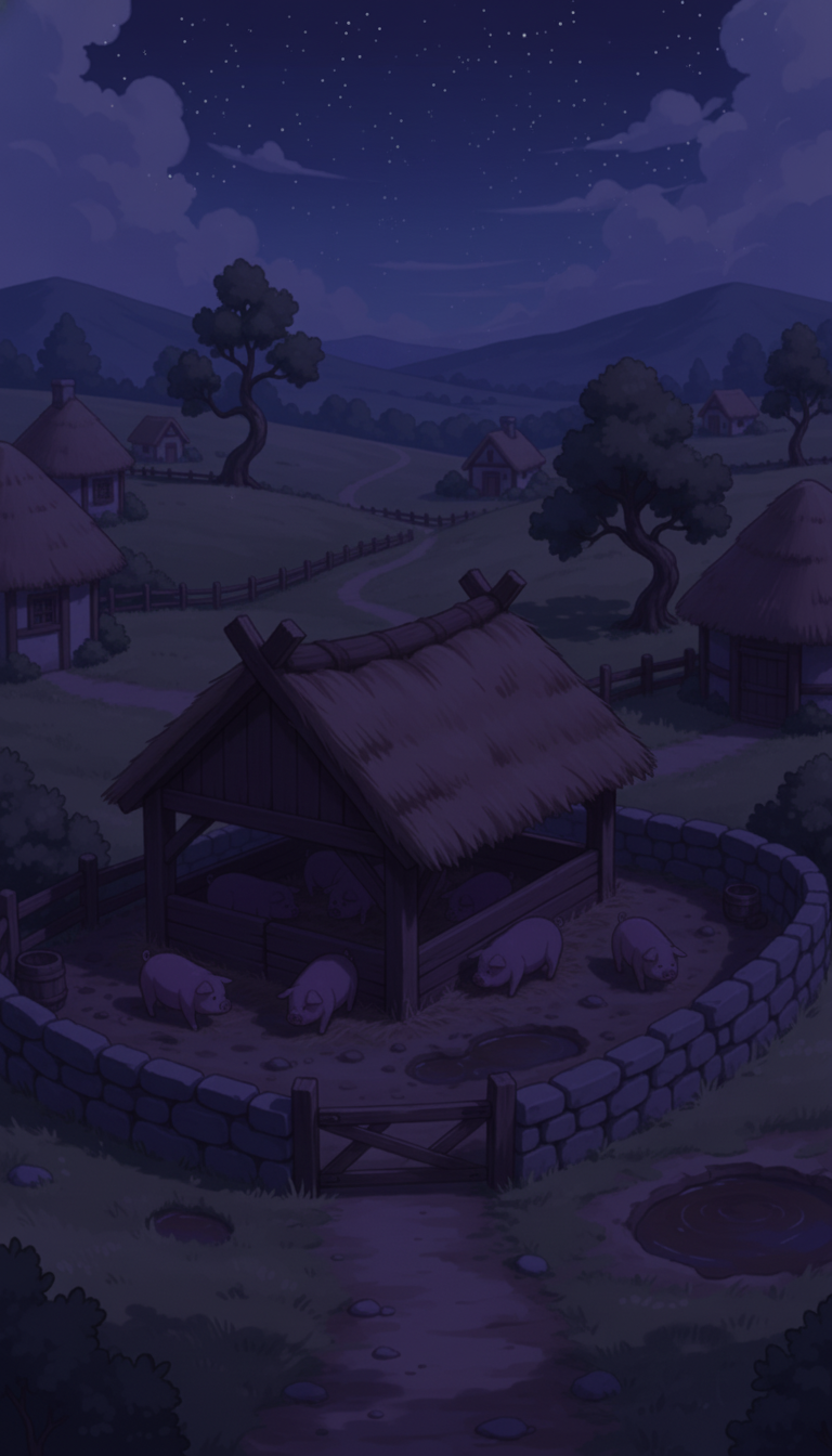 星空に眠る豚小屋|静寂の中世牧場ナイトシーン