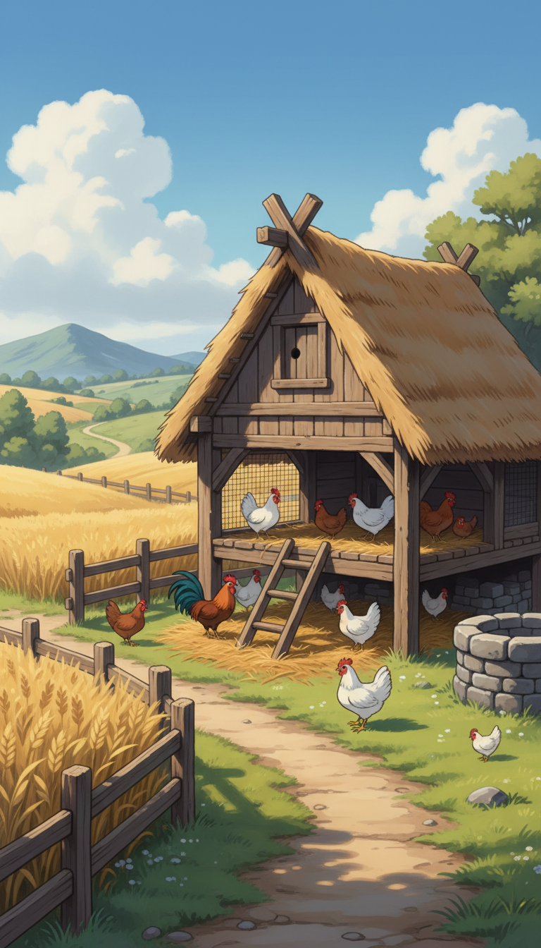 小麦畑に囲まれた鶏小屋|中世ファンタジー鶏舎背景