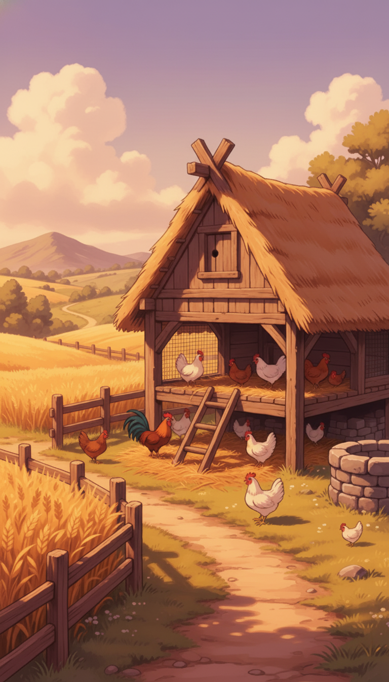 小麦畑と青空の下、ニワトリたちがにぎやかに動き回る中世風の鶏小屋が描かれた農場背景です。