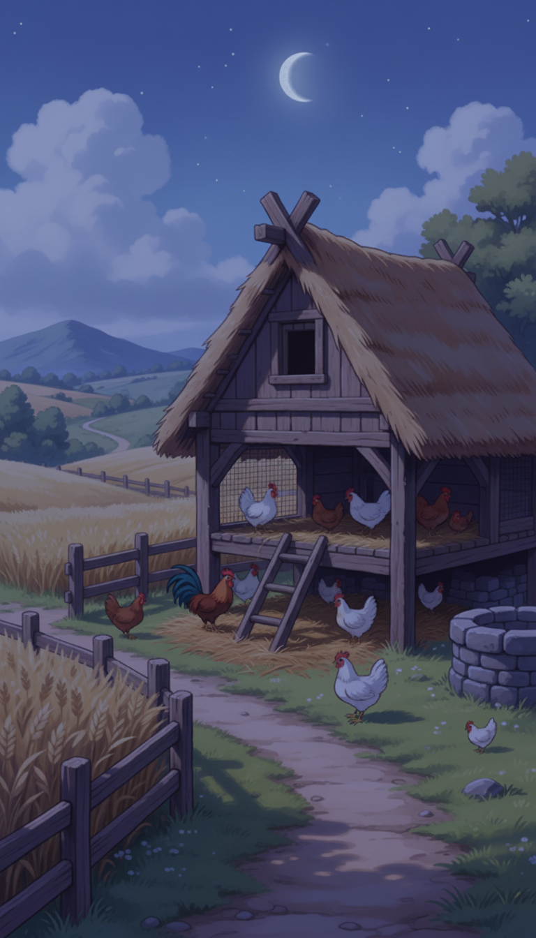 月夜の鶏小屋と田園風景|中世ファンタジー夜の農場背景