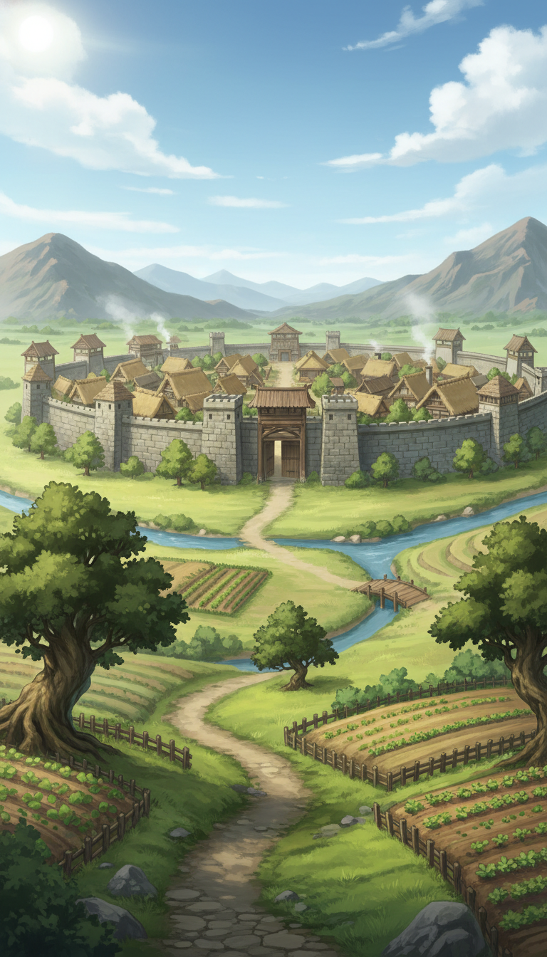 畑と川に囲まれた城壁都市を遠景から眺める、RPGワールドマップ風の中世ファンタジー背景です。
