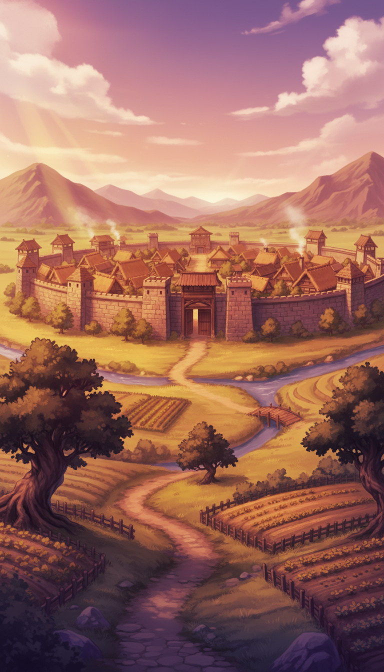 夕日が城壁都市と畑を黄金色に照らし、物語の転機やイベントシーンに使いやすい中世背景です。