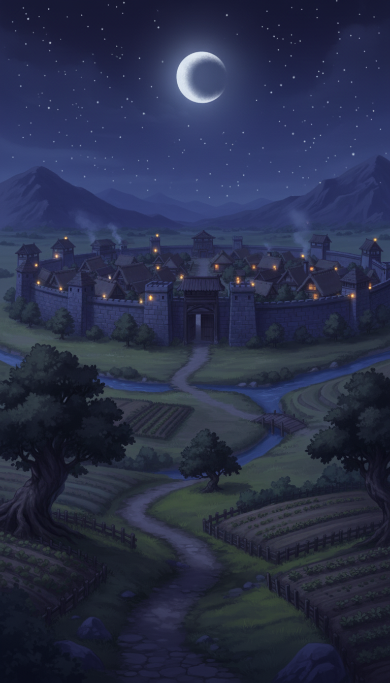 星空と大きな月に照らされ、灯りが点る城壁都市と農地が幻想的に輝くナイトタウン背景です。