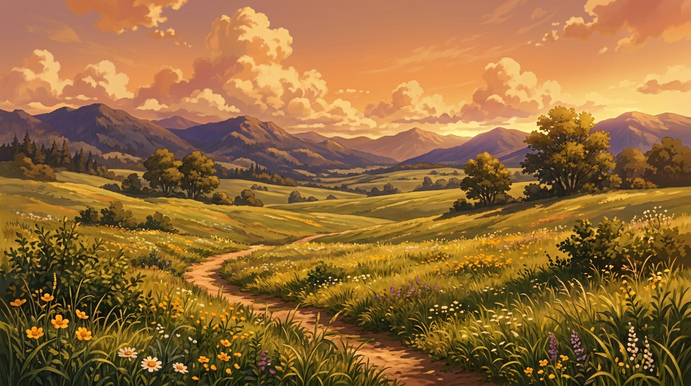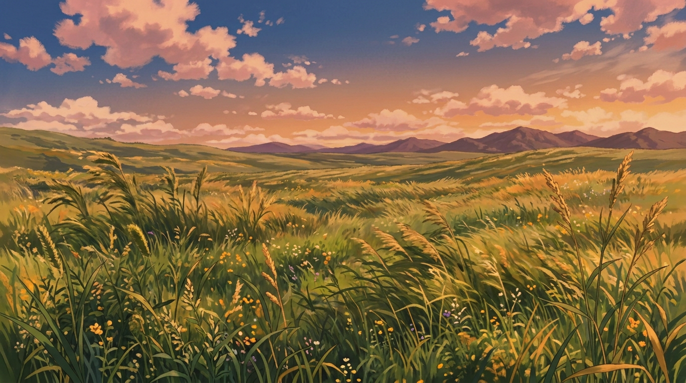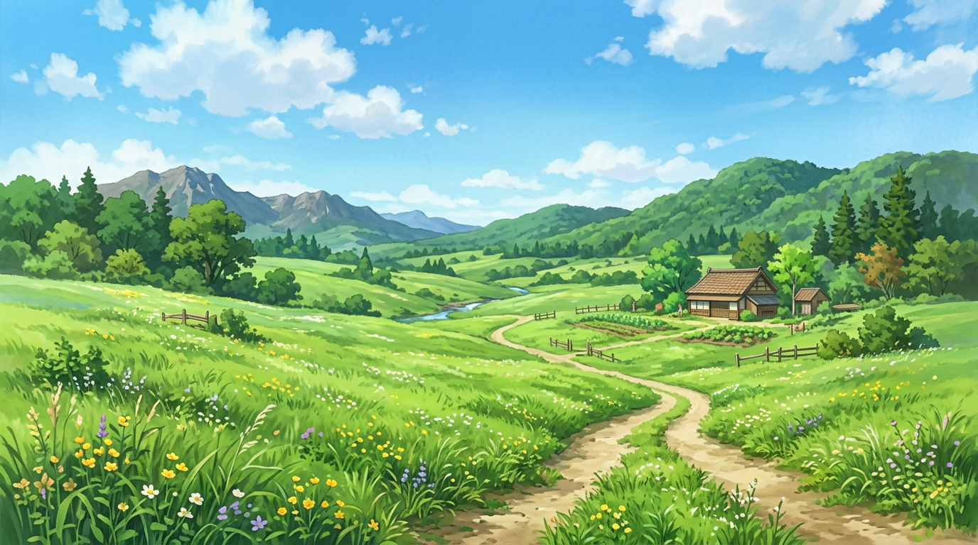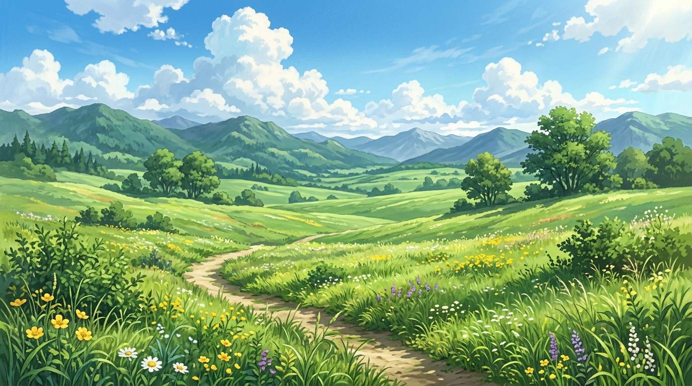 草原の背景イラスト素材を無料配布。16:9の横長構図でPC向け作品に使いやすい背景イラストです。漫画・Webtoonやゲーム背景として商用・トレース利用もOK!