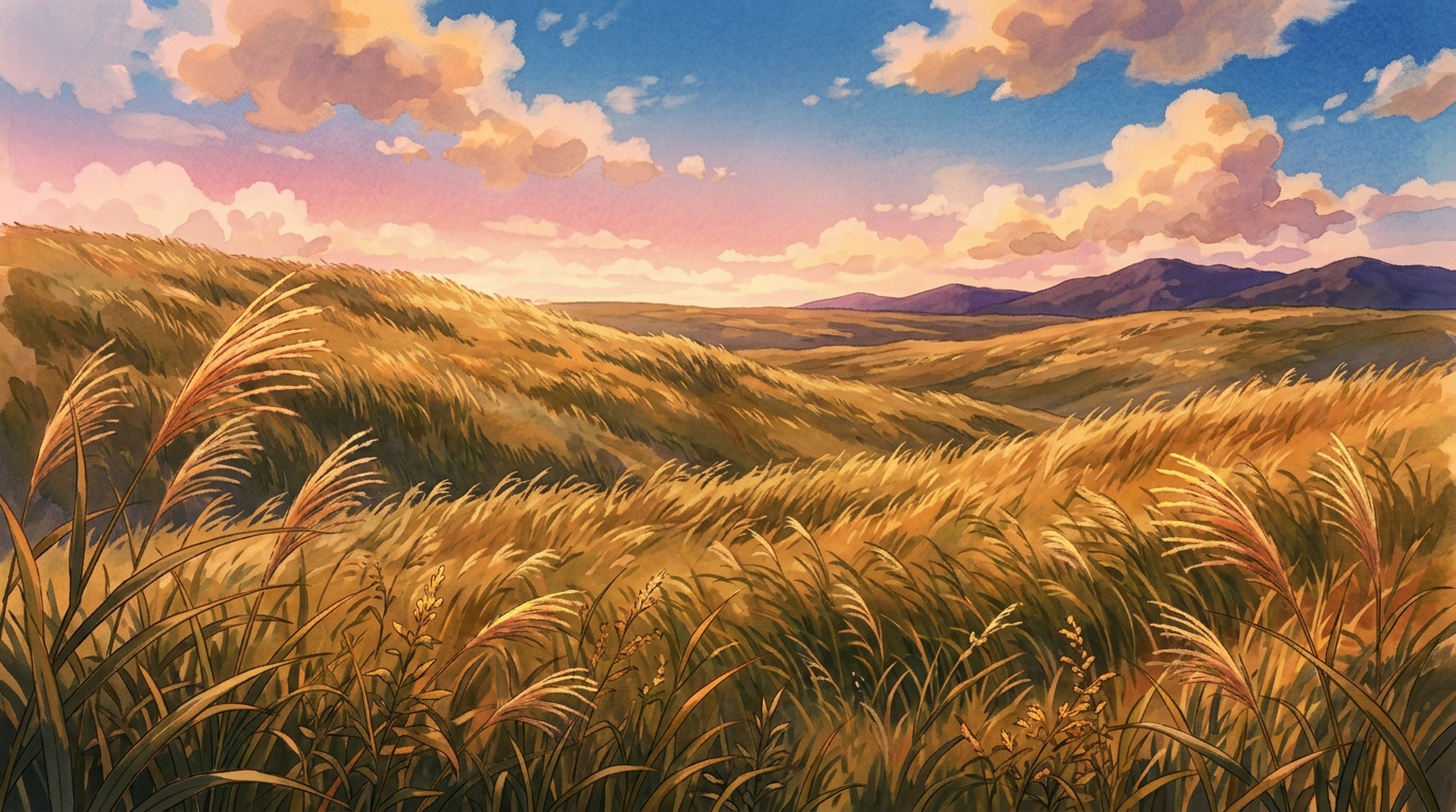 夕日を受けて輝く草原が、ノスタルジックな背景に仕上がります。