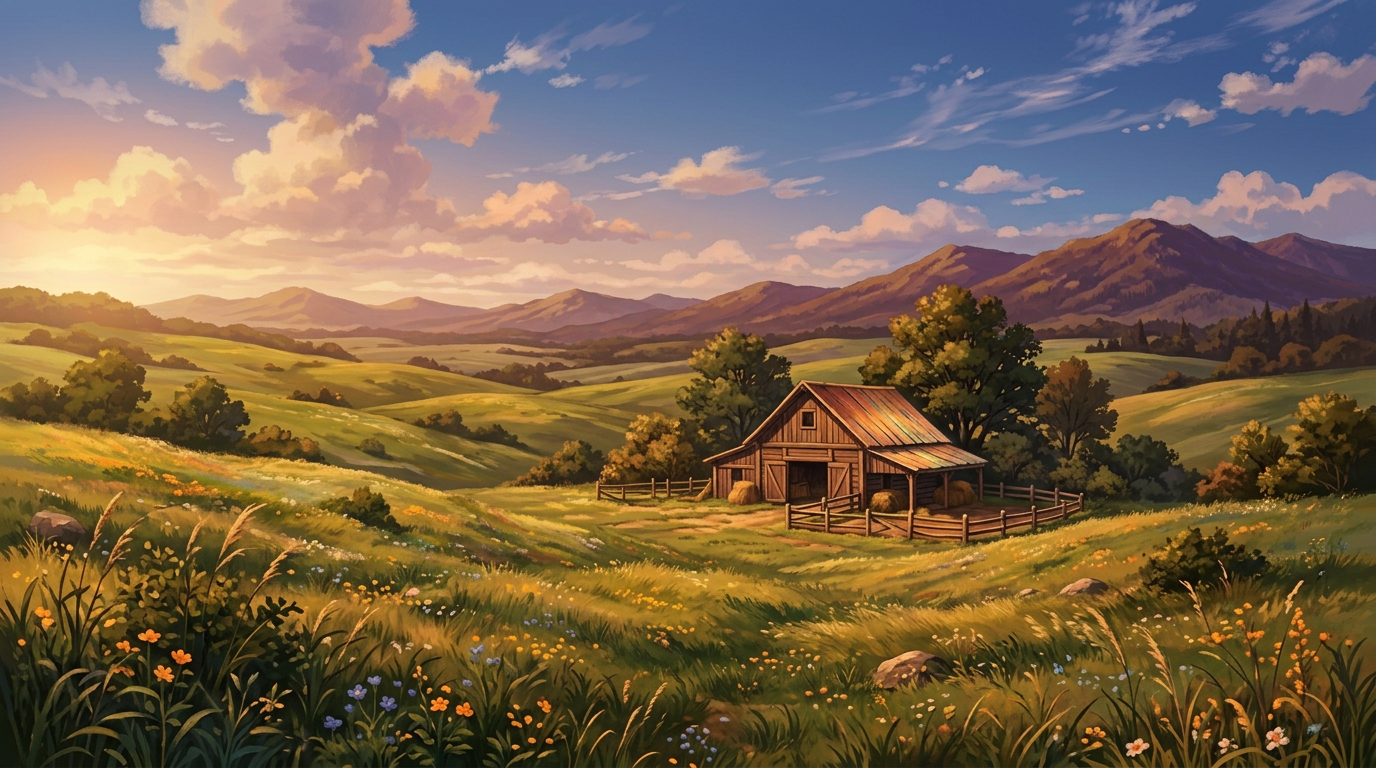 夕日に照らされた牧舎と丘の広がりが、ノスタルジックな田園背景になります。