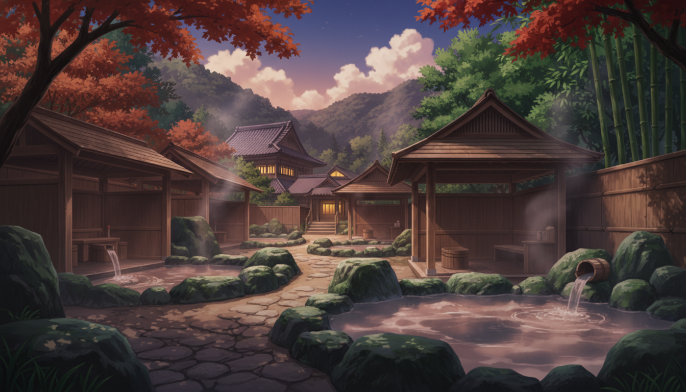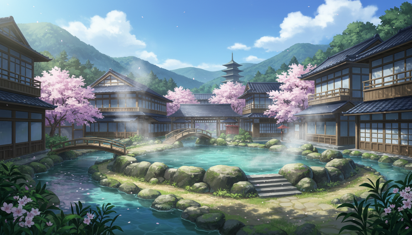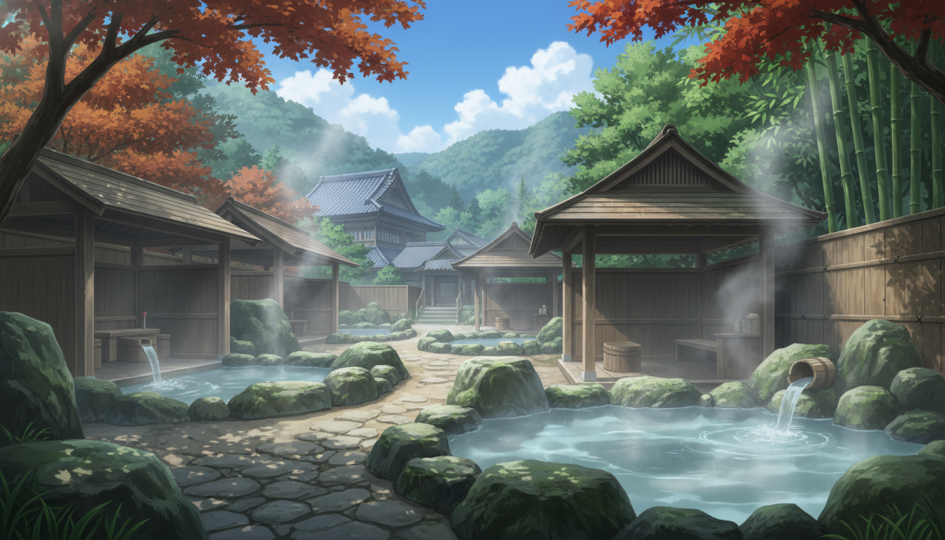 温泉の背景イラスト素材を無料配布。16:9の横長構図でPC向け作品に使いやすい背景イラストです。漫画・Webtoonやゲーム背景として商用・トレース利用もOK!
