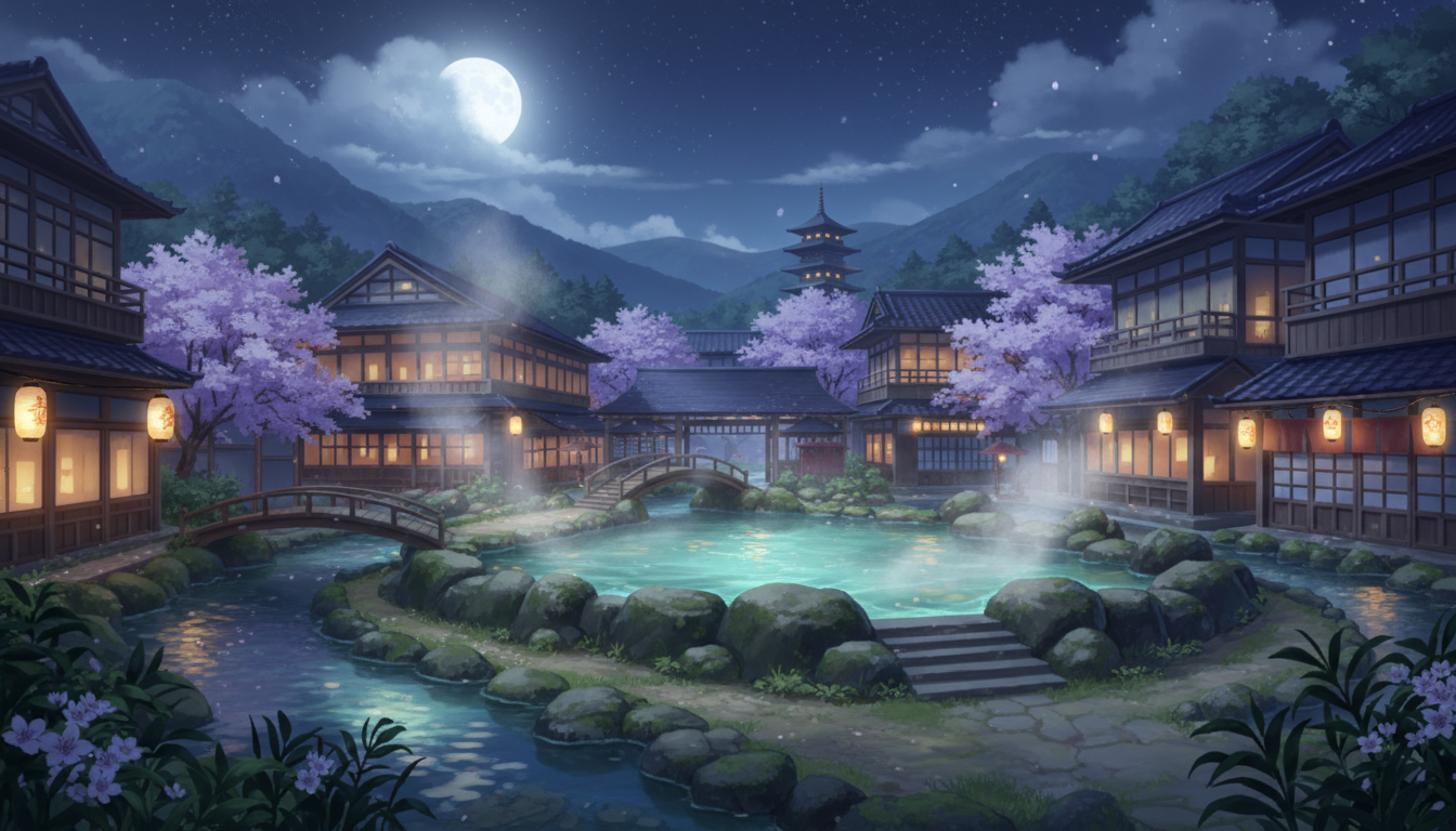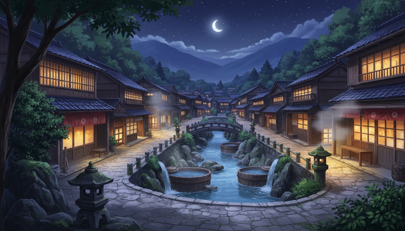 月明かりと灯りに照らされた温泉街が、幻想的で静かな夜の雰囲気を作り出します。