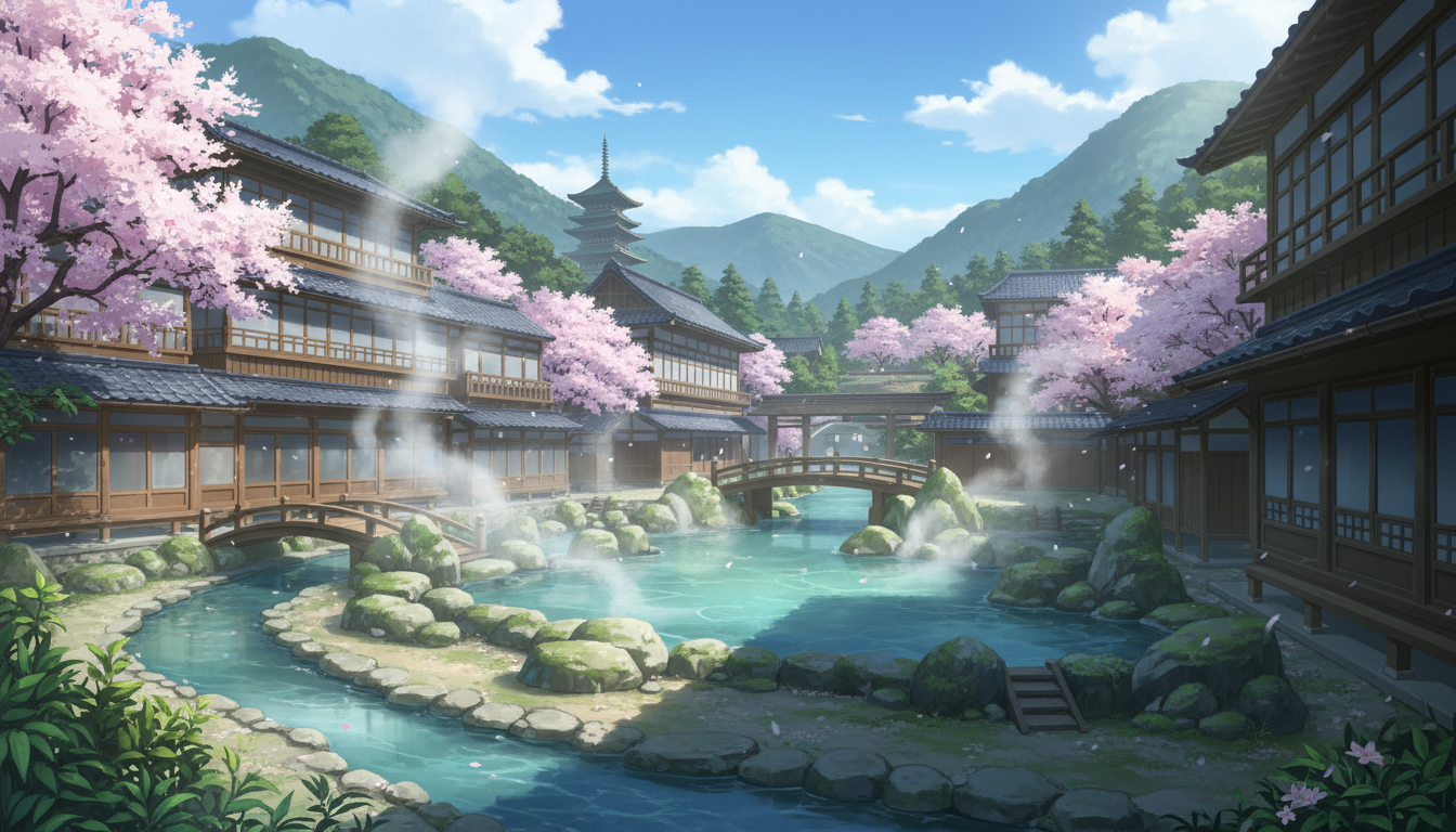満開の桜と湯けむり立つ温泉街が、穏やかで情緒ある雰囲気を演出します。