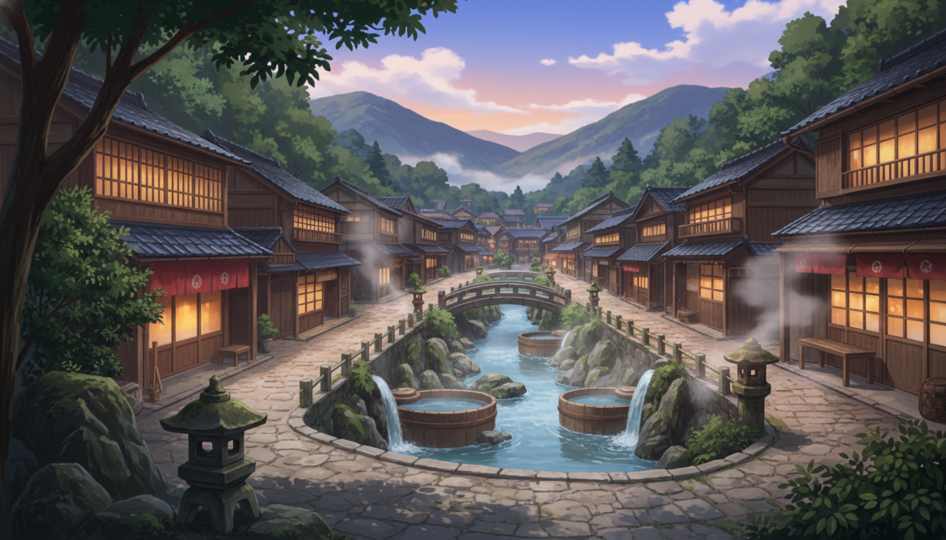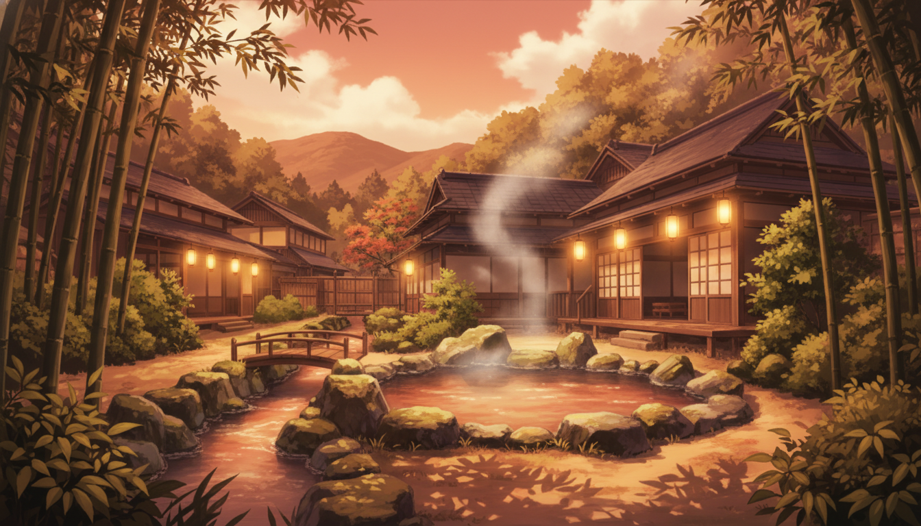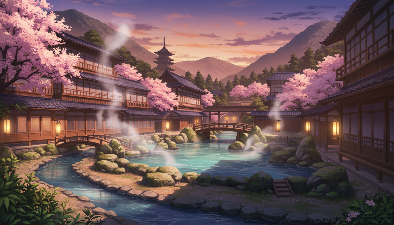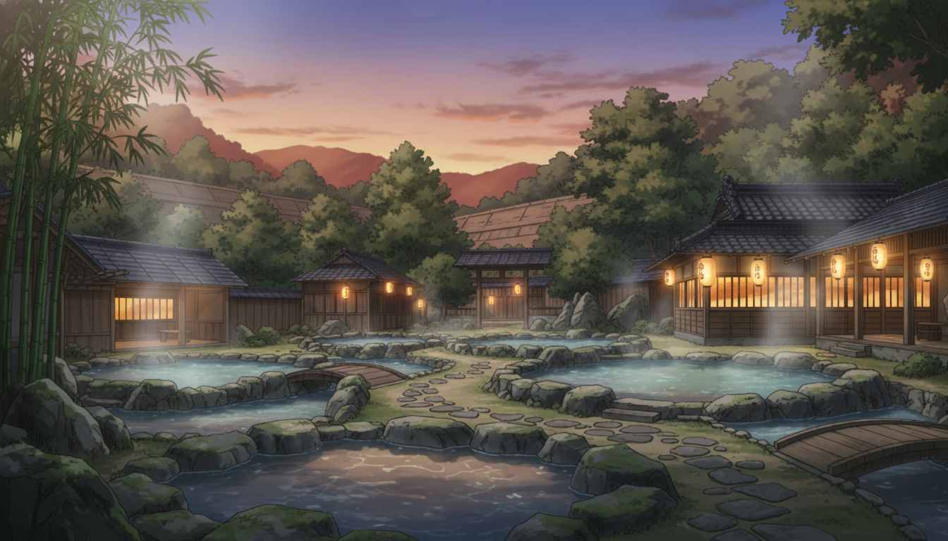 夕焼け空に染まる建物と温泉が、落ち着いた時間帯の情景を表現しています。