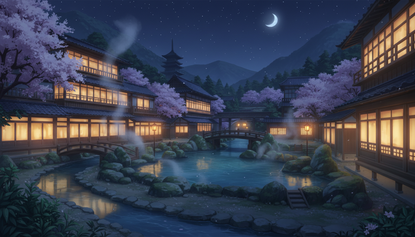 夜空と月に照らされた橋と温泉街が、物語性の高いシーンに適しています。