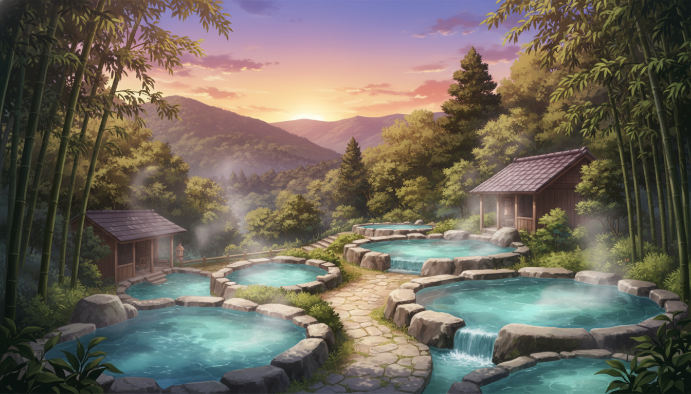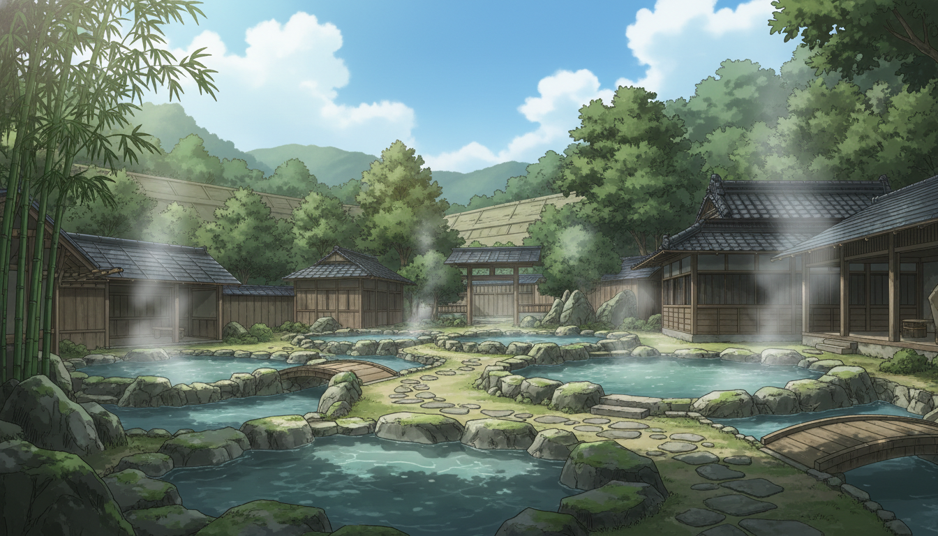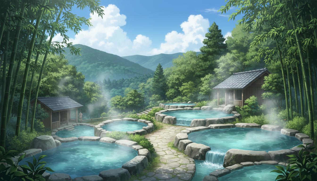 青空の下に点在する露天風呂が、健康的で爽やかな温泉地の情景を描いています。