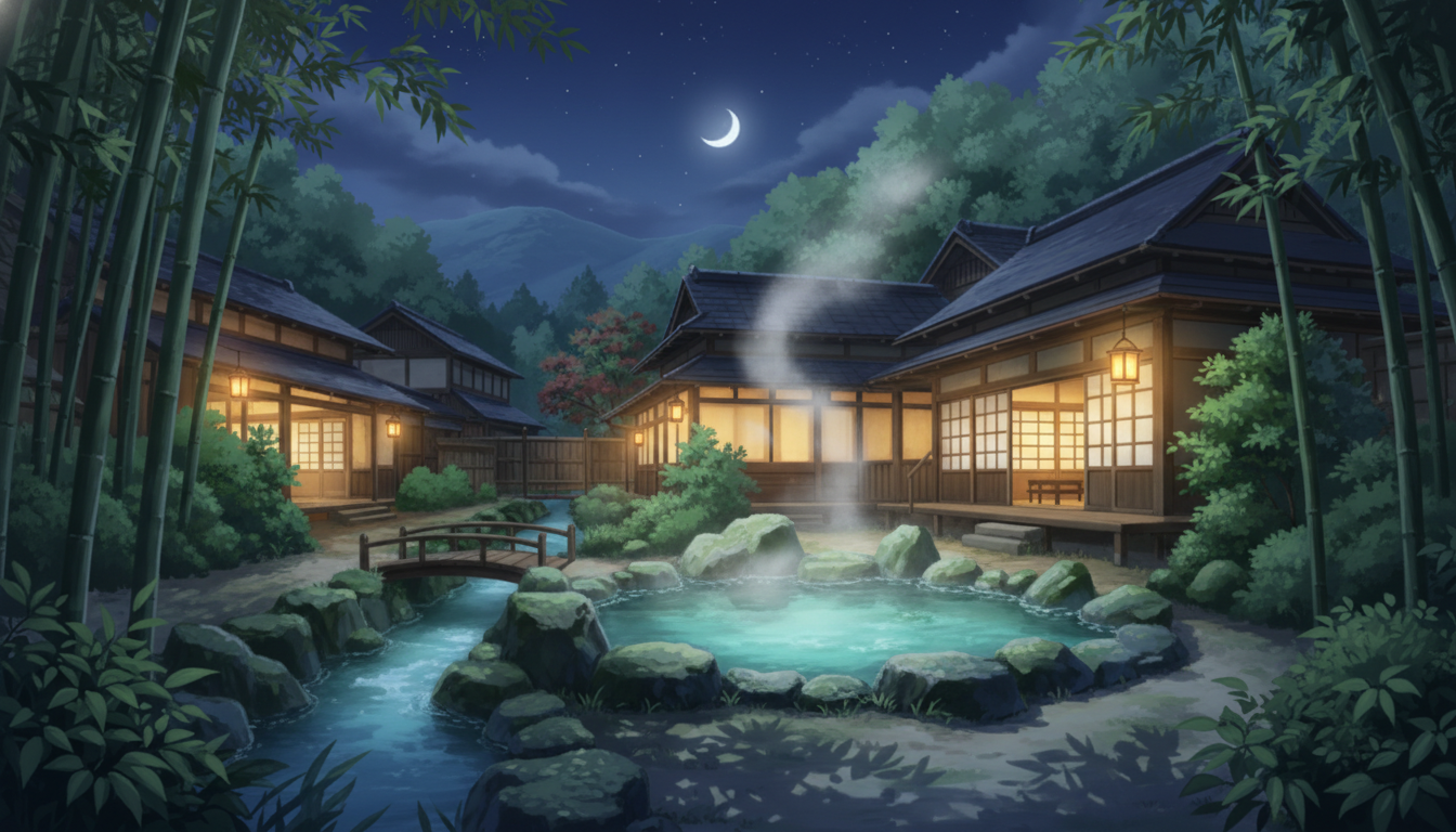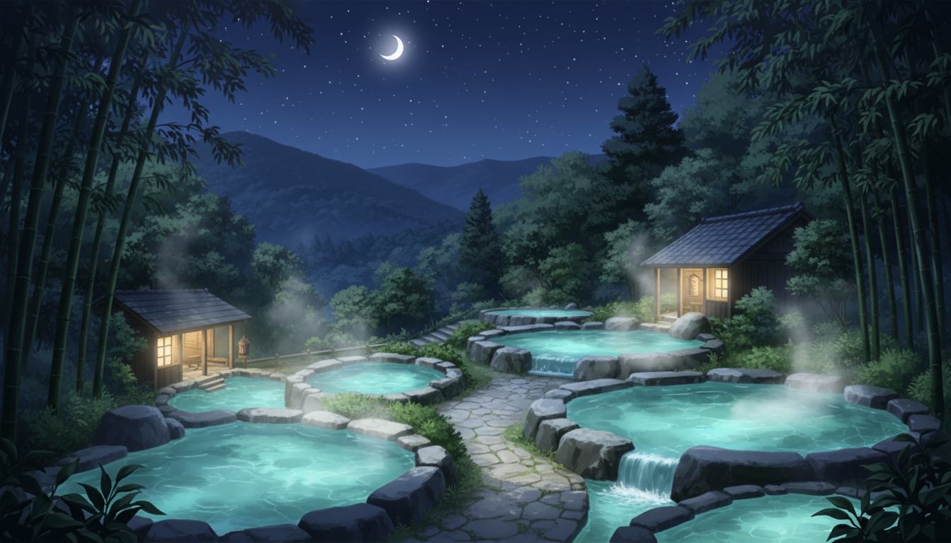 月夜と竹林に囲まれた露天風呂が、静寂と癒しを感じさせます。
