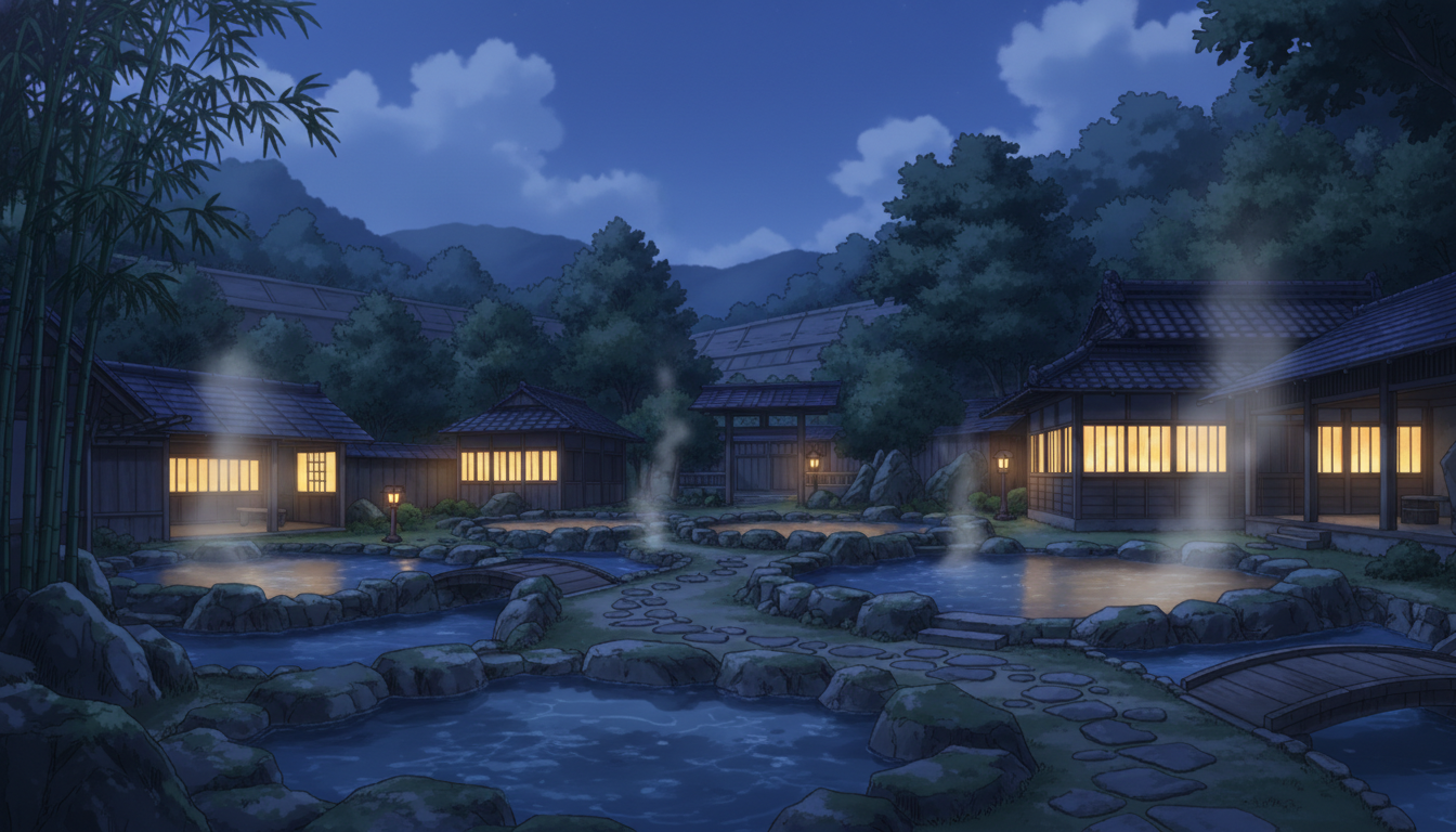温泉の背景イラスト(横長/16:9)を無料で配布します。PC向け作品に便利な横長の素材です。時間帯差分のイラストもありとても便利です。ウェブトゥーン/ゲーム/漫画、その他広告を含めてご活用ください。商用利用可&無償、トレース、加筆修正可。