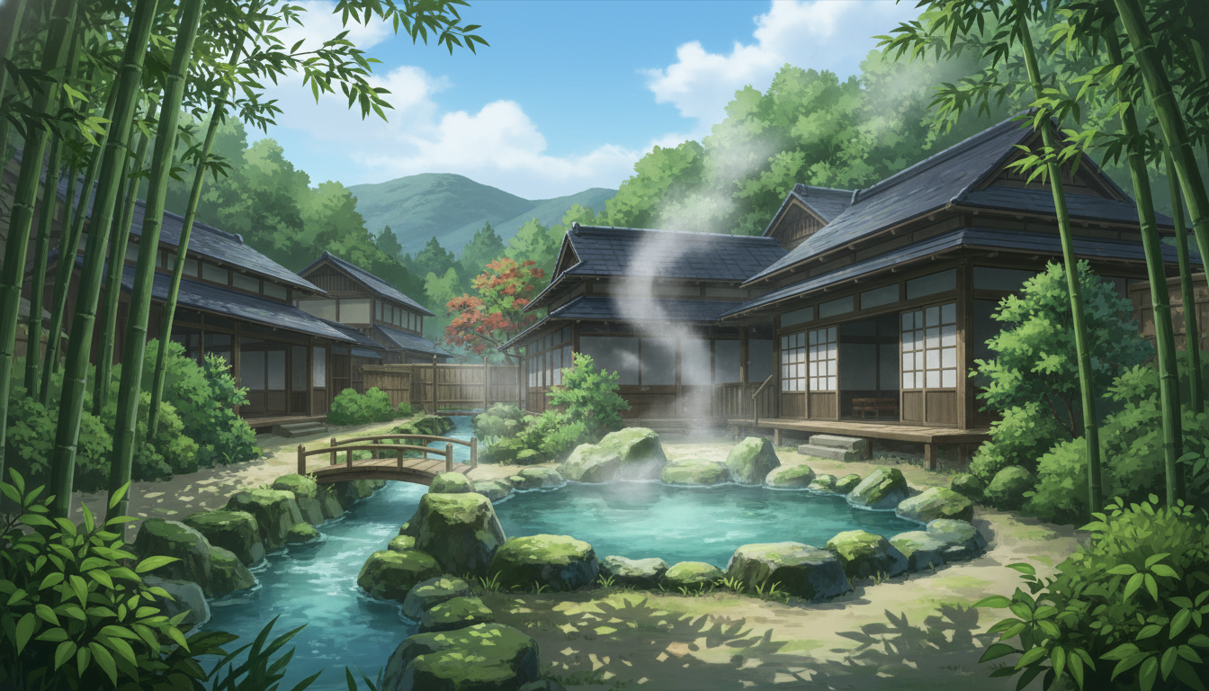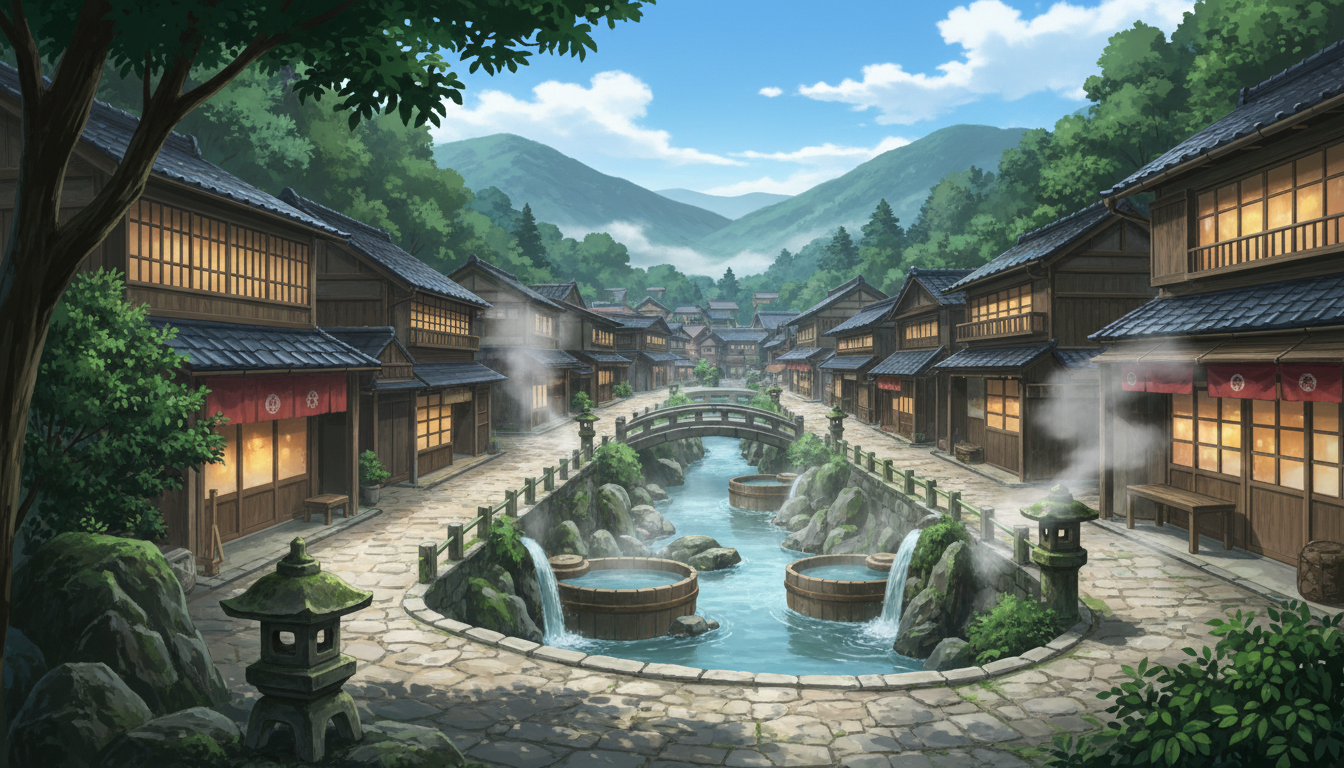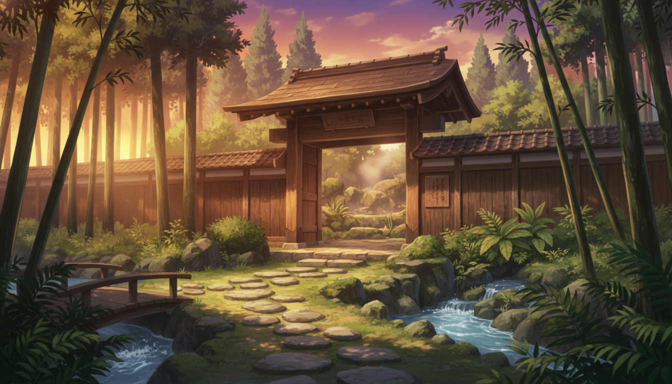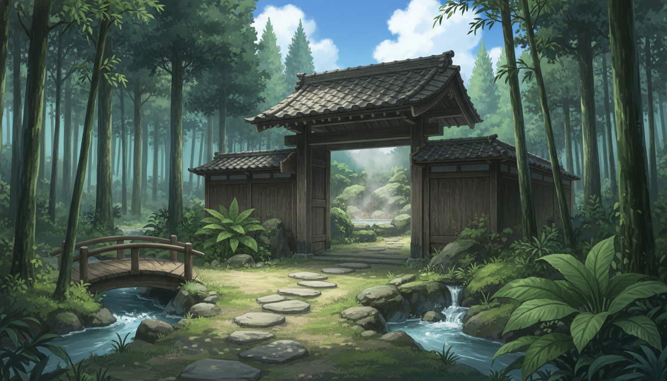 木々に囲まれた門と小川が、自然豊かな温泉地の入口を描いています。