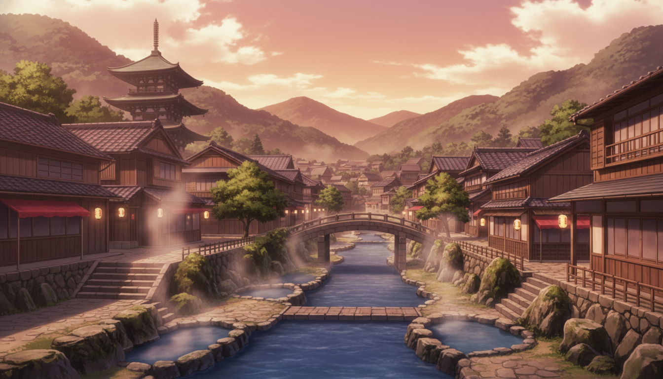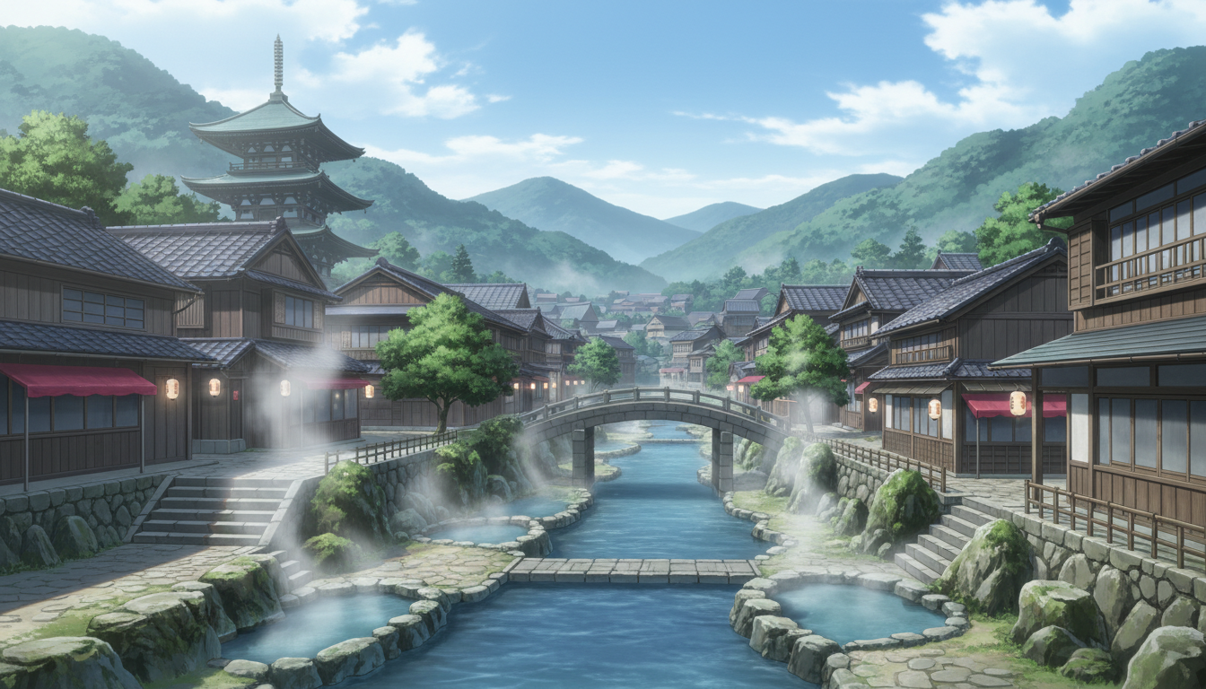 川の流れと温泉街が調和し、旅情を感じさせる背景です。