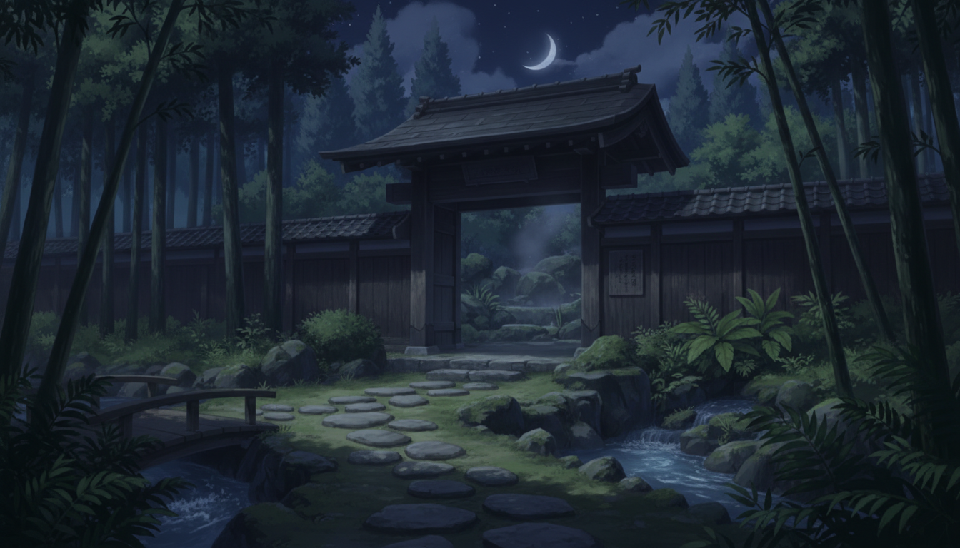 満月に照らされた温泉宿の門と森|温泉宿の背景素材