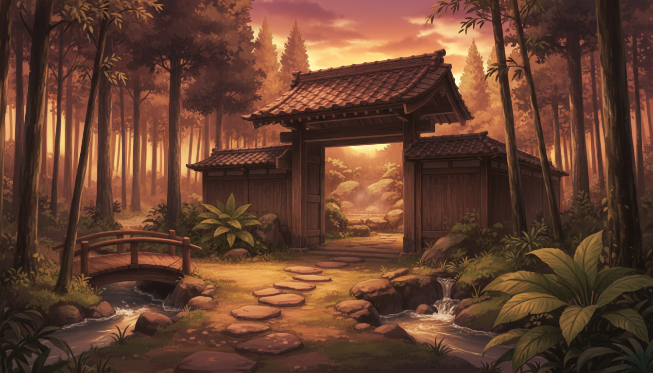 夕焼けの森と温泉宿の門構え|温泉宿の背景素材
