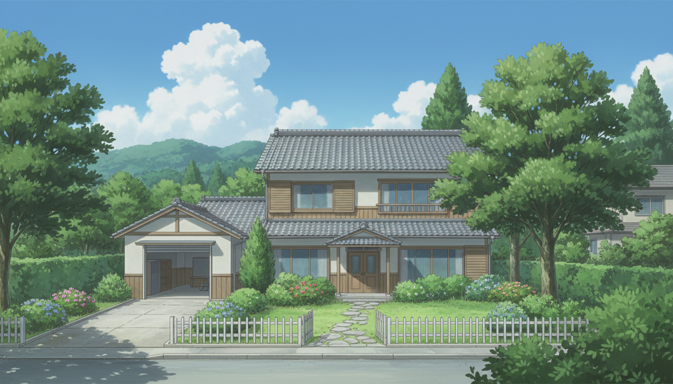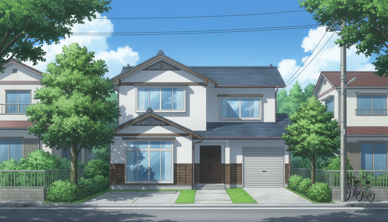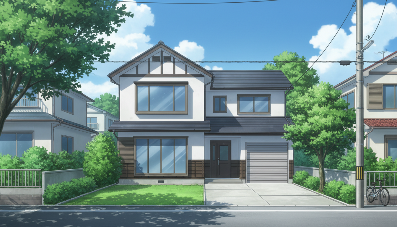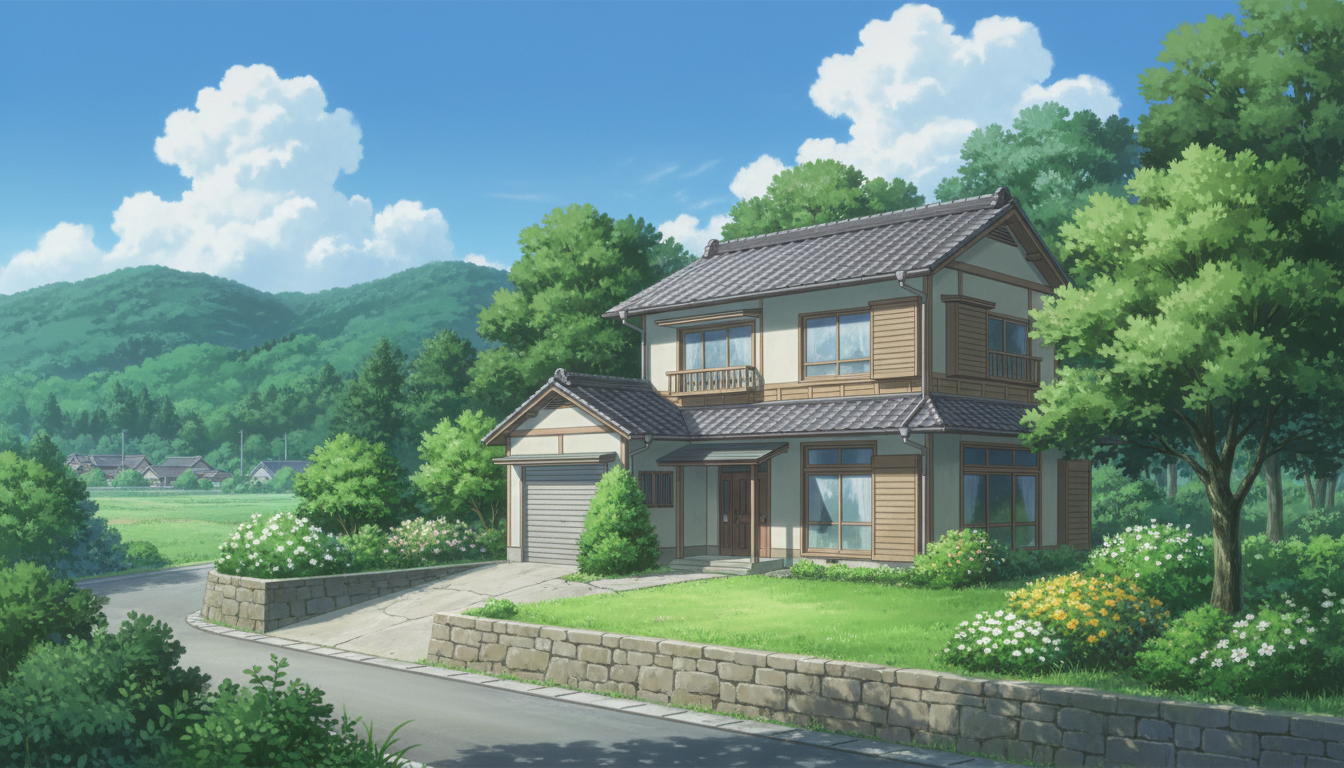 一軒家の背景イラスト素材を無料配布。16:9の横長構図でPC向け作品に使いやすい背景イラストです。漫画・Webtoonやゲーム背景として商用・トレース利用もOK!