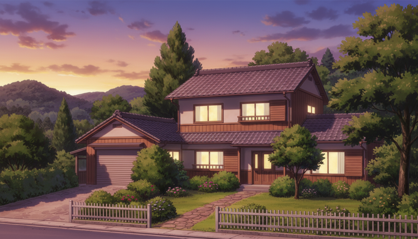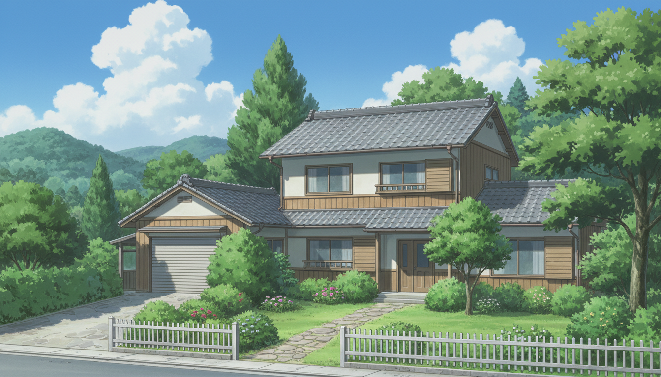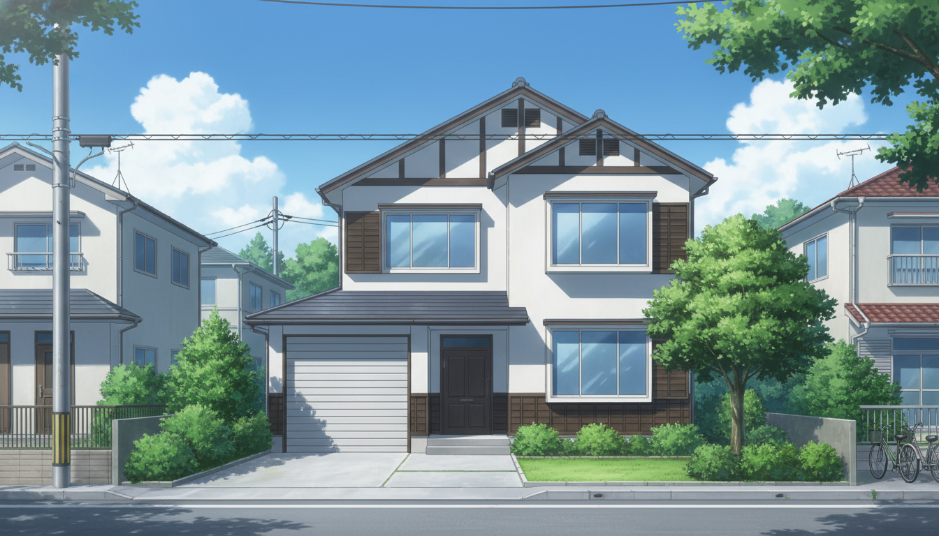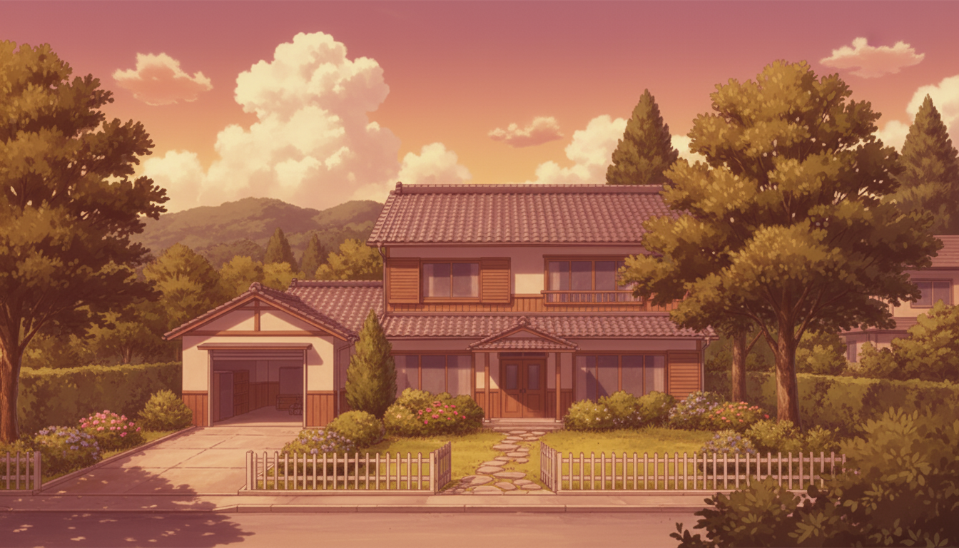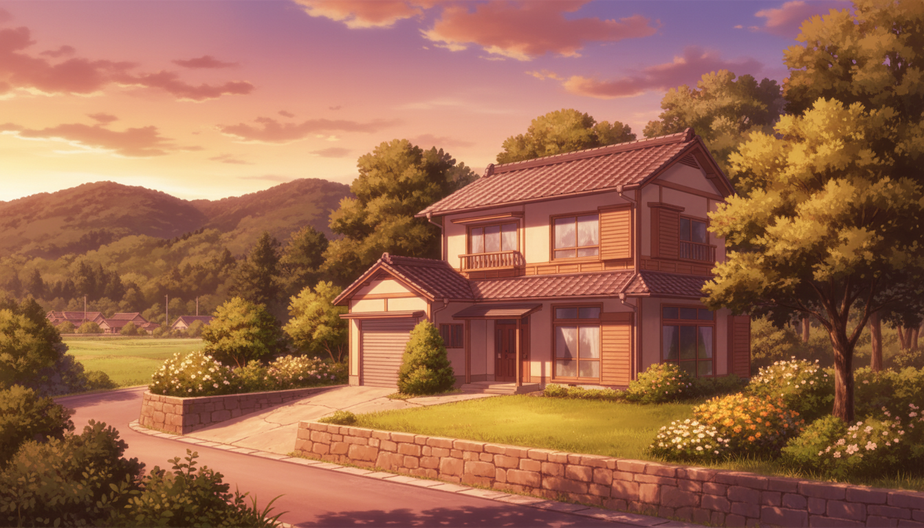 一軒家の背景イラスト素材を無料配布。16:9の横長構図でPC向け作品に使いやすい背景イラストです。漫画・Webtoonやゲーム背景として商用・トレース利用もOK!