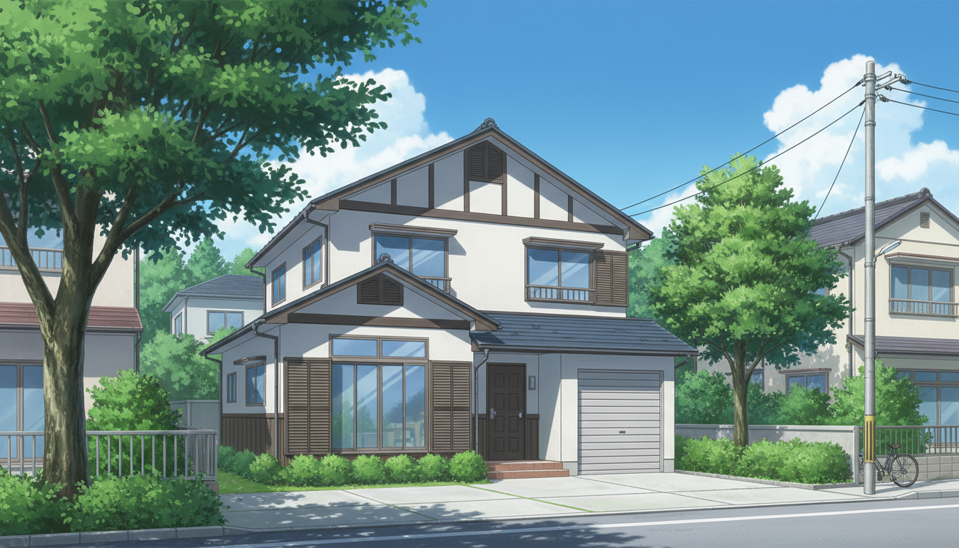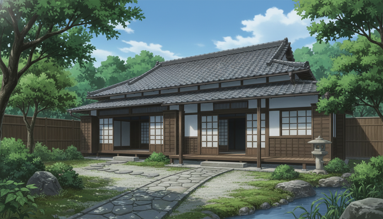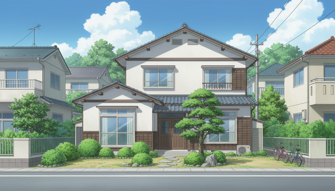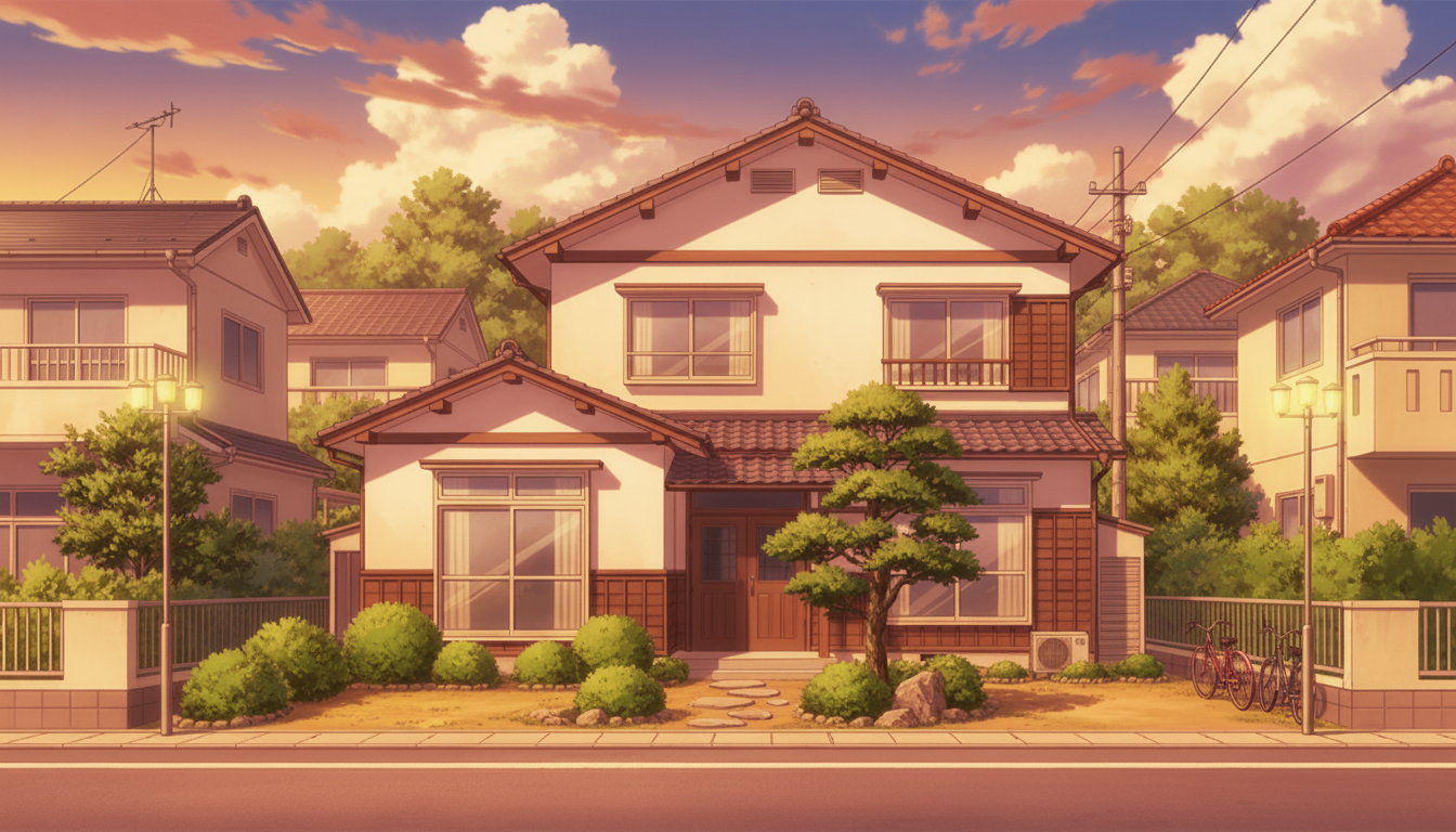 一軒家の背景イラスト素材を無料配布。16:9の横長構図でPC向け作品に使いやすい背景イラストです。漫画・Webtoonやゲーム背景として商用・トレース利用もOK!