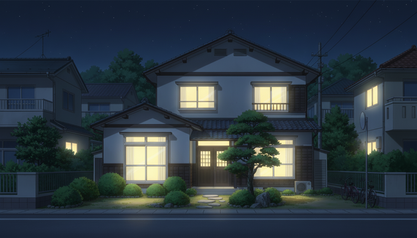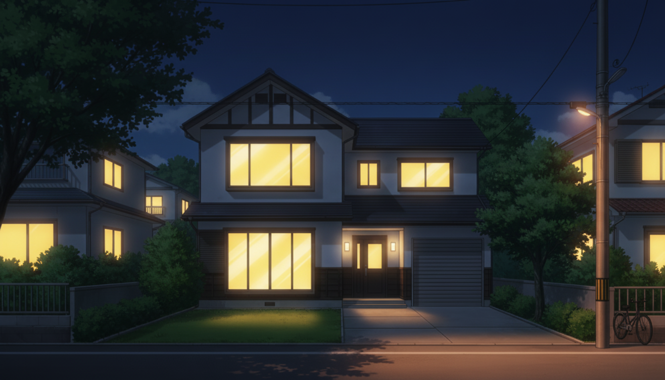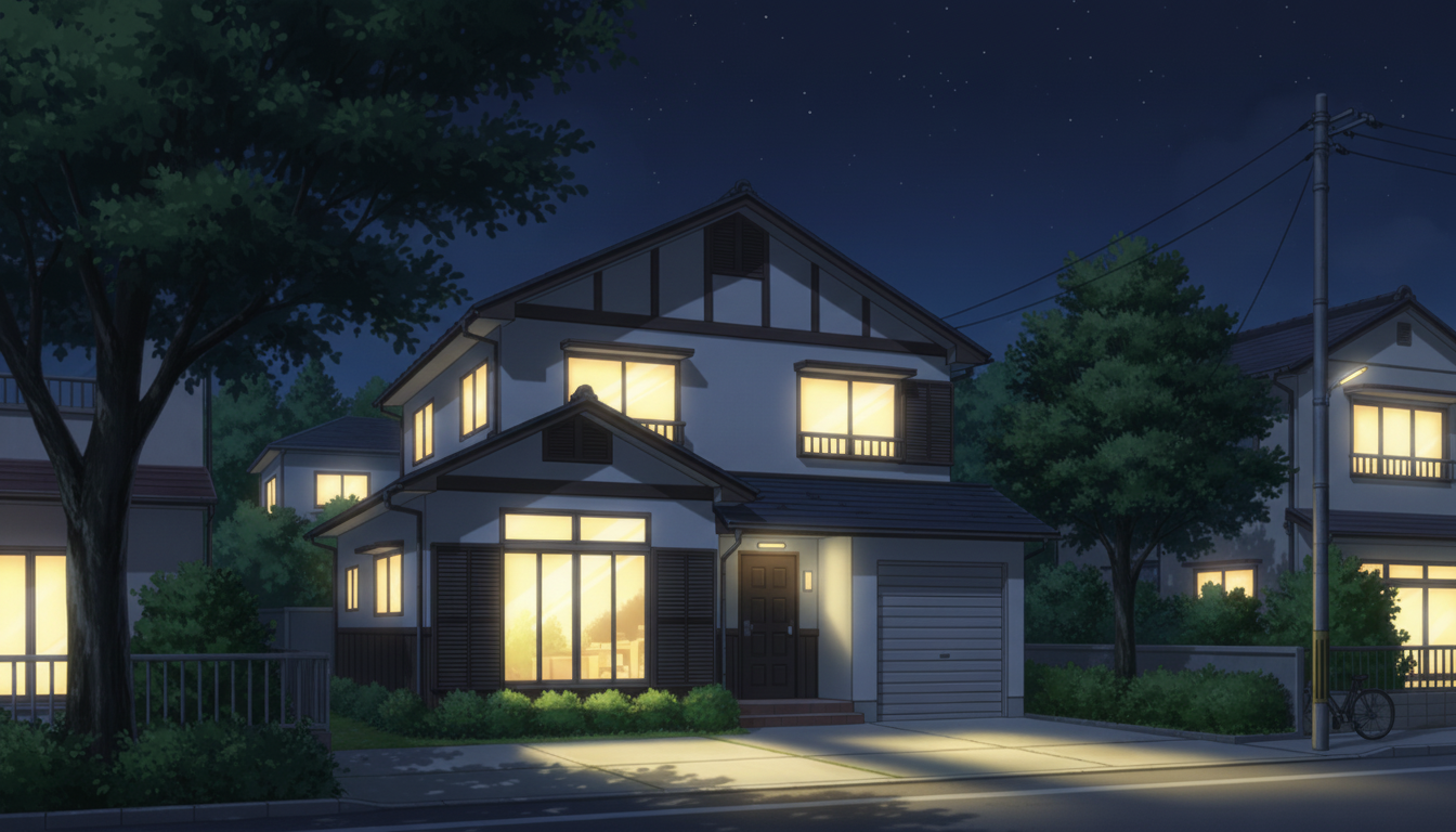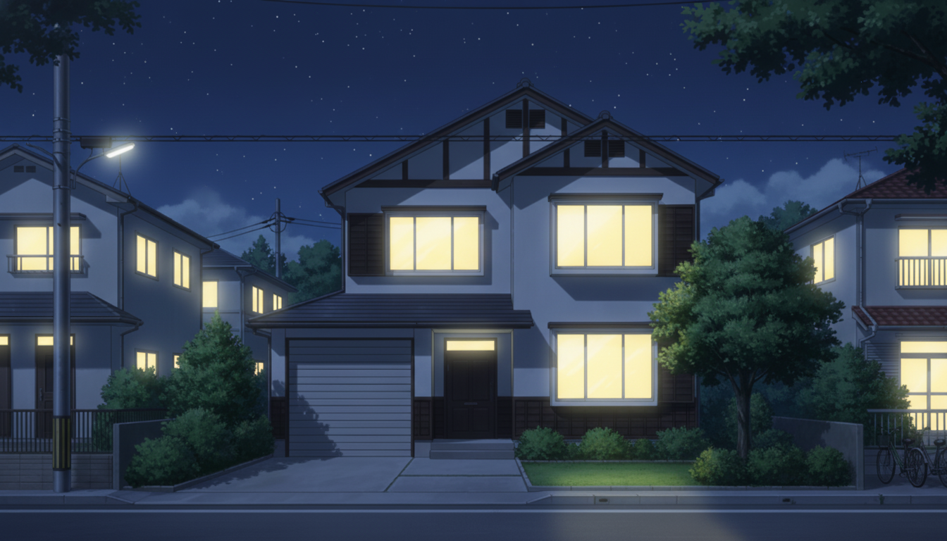 家々の明かりが温かく灯る、落ち着いた夜の住宅街シーンです。