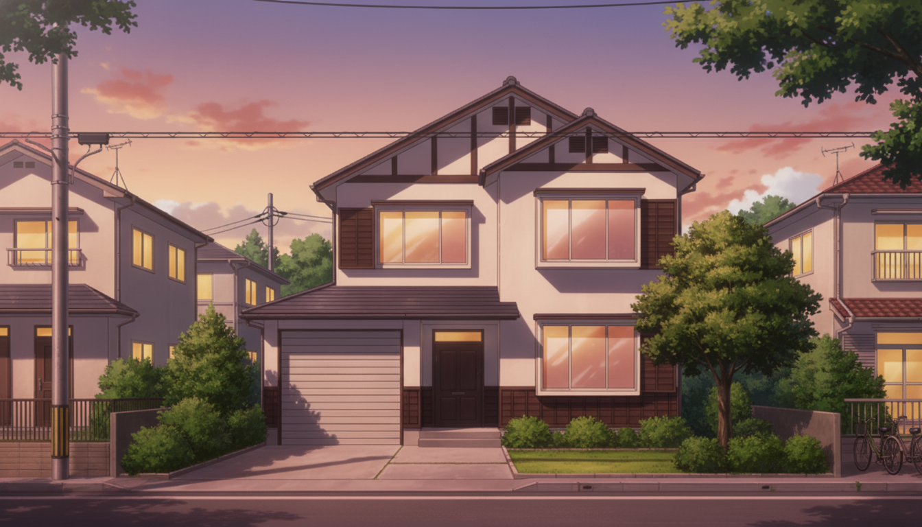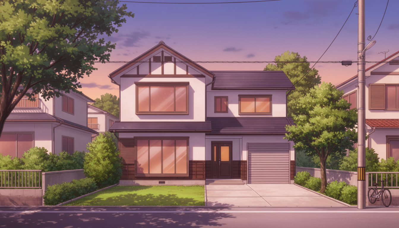 夕方の斜光が家と樹木を柔らかく染め、エモーショナルな住宅街を描ける背景です。
