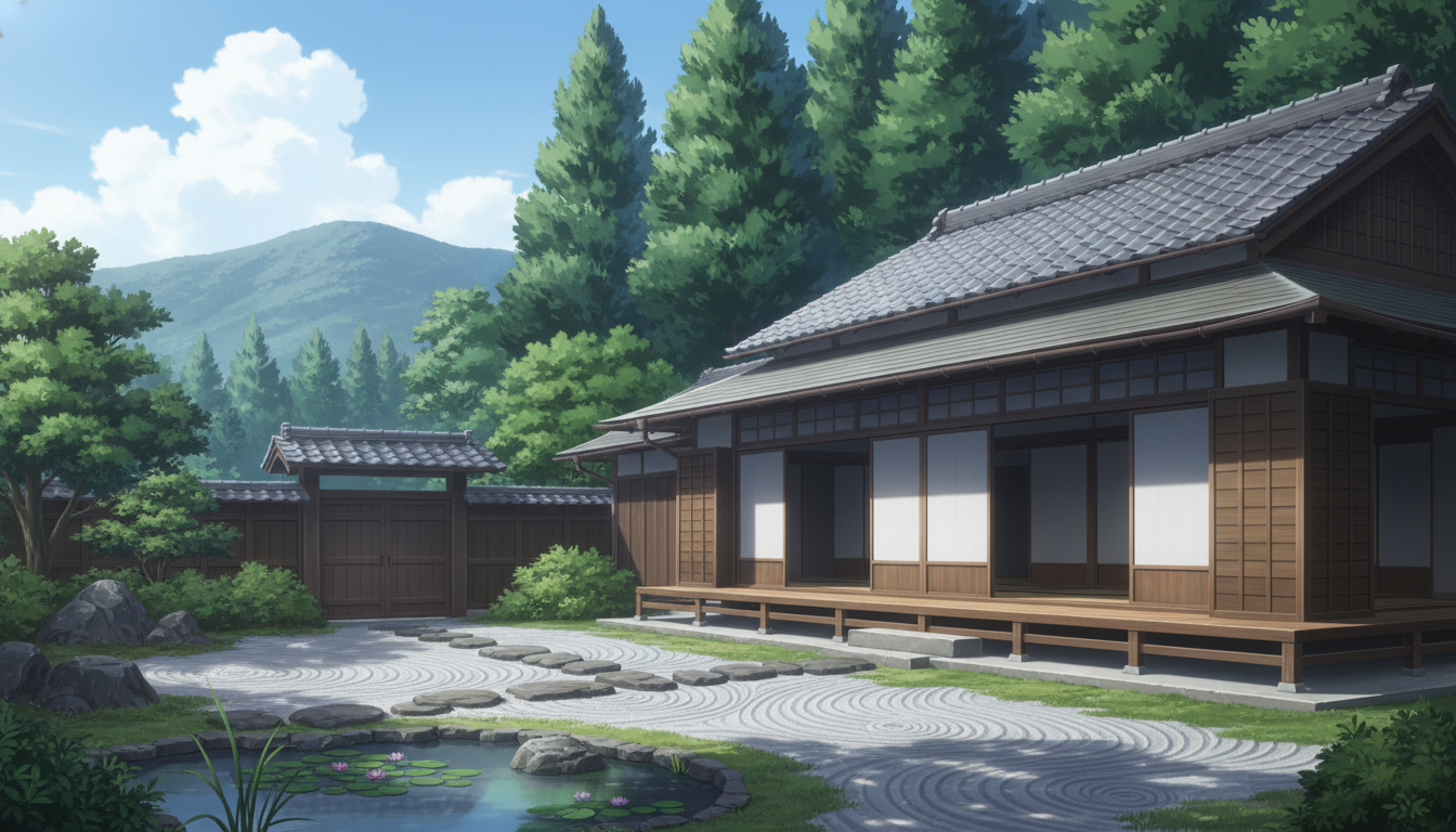 縁側と砂紋の庭が広がる景色で、和の暮らしや旅情シーンに最適な背景です。