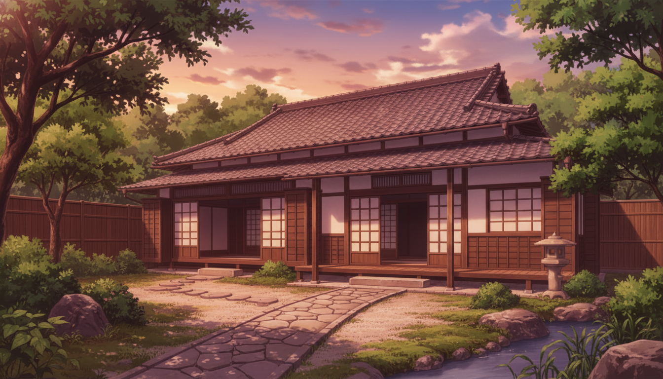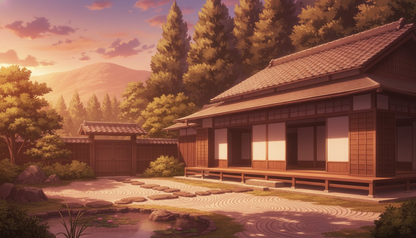 夕焼けが屋根瓦と庭を温かく包み、静かな余韻を残す和風背景です。