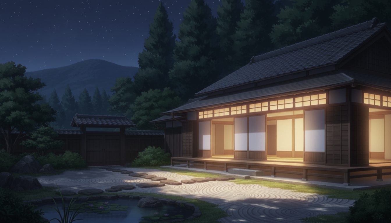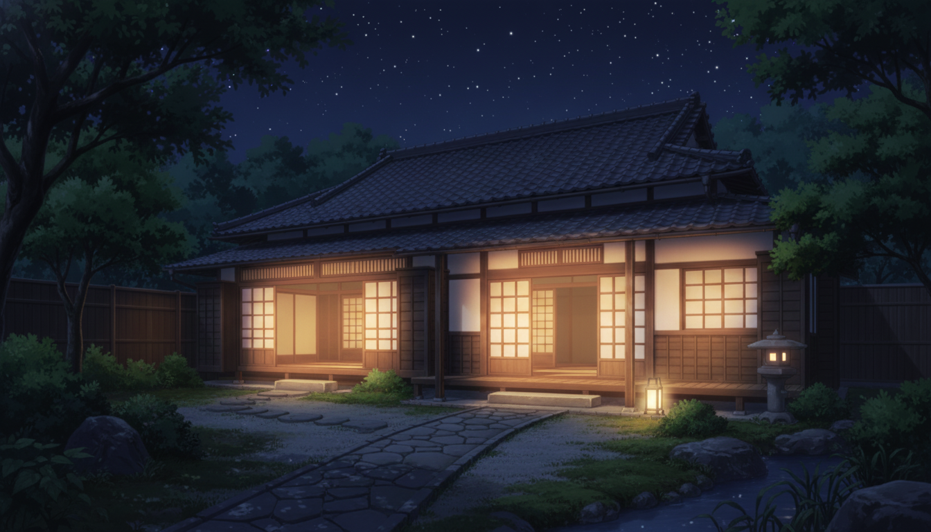 星明かりに灯る古民家|夜の縁側と静寂の庭