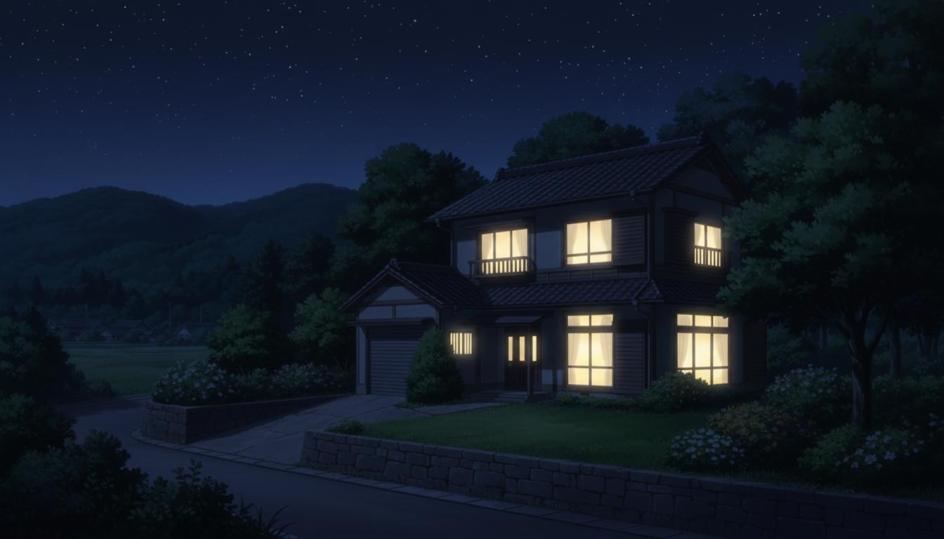 夜の平屋と灯り|静かな田園の夜更け