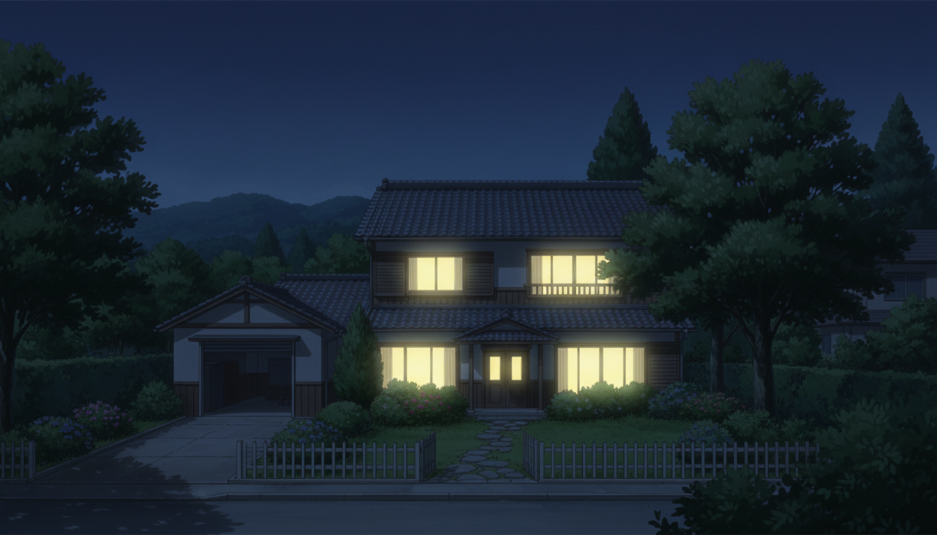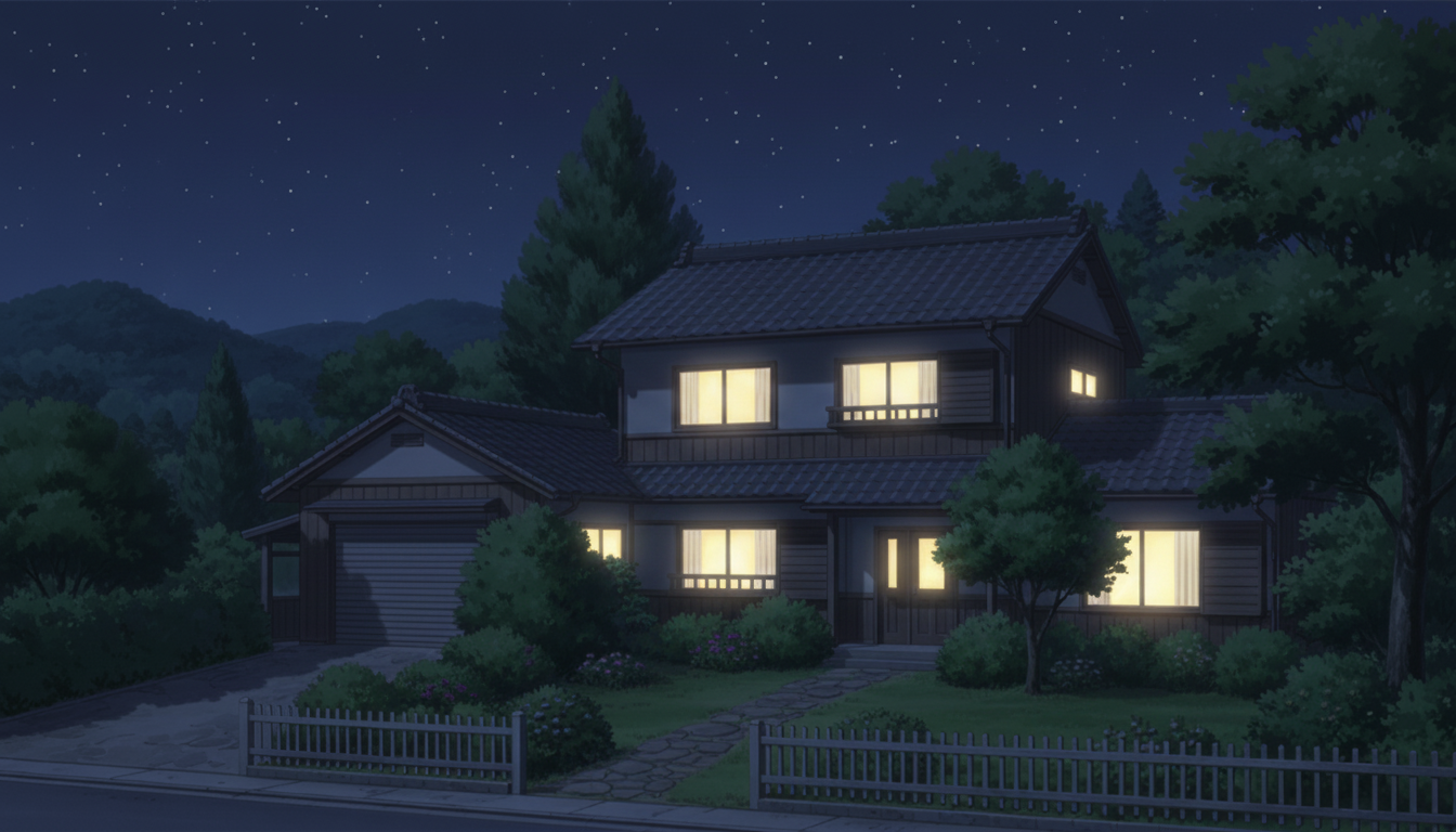 森の暗さと家の明かりが印象的で、秘密の出来事や静かな夜の演出に向く背景です。