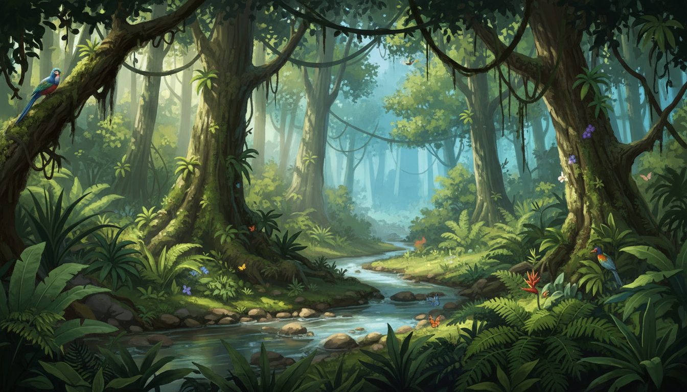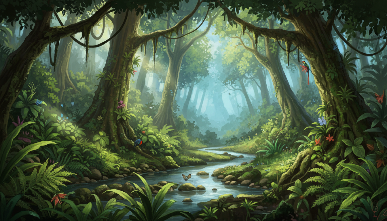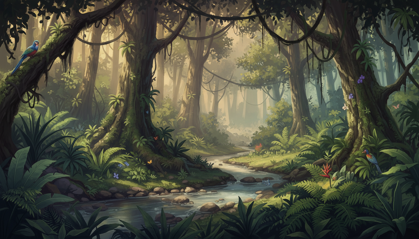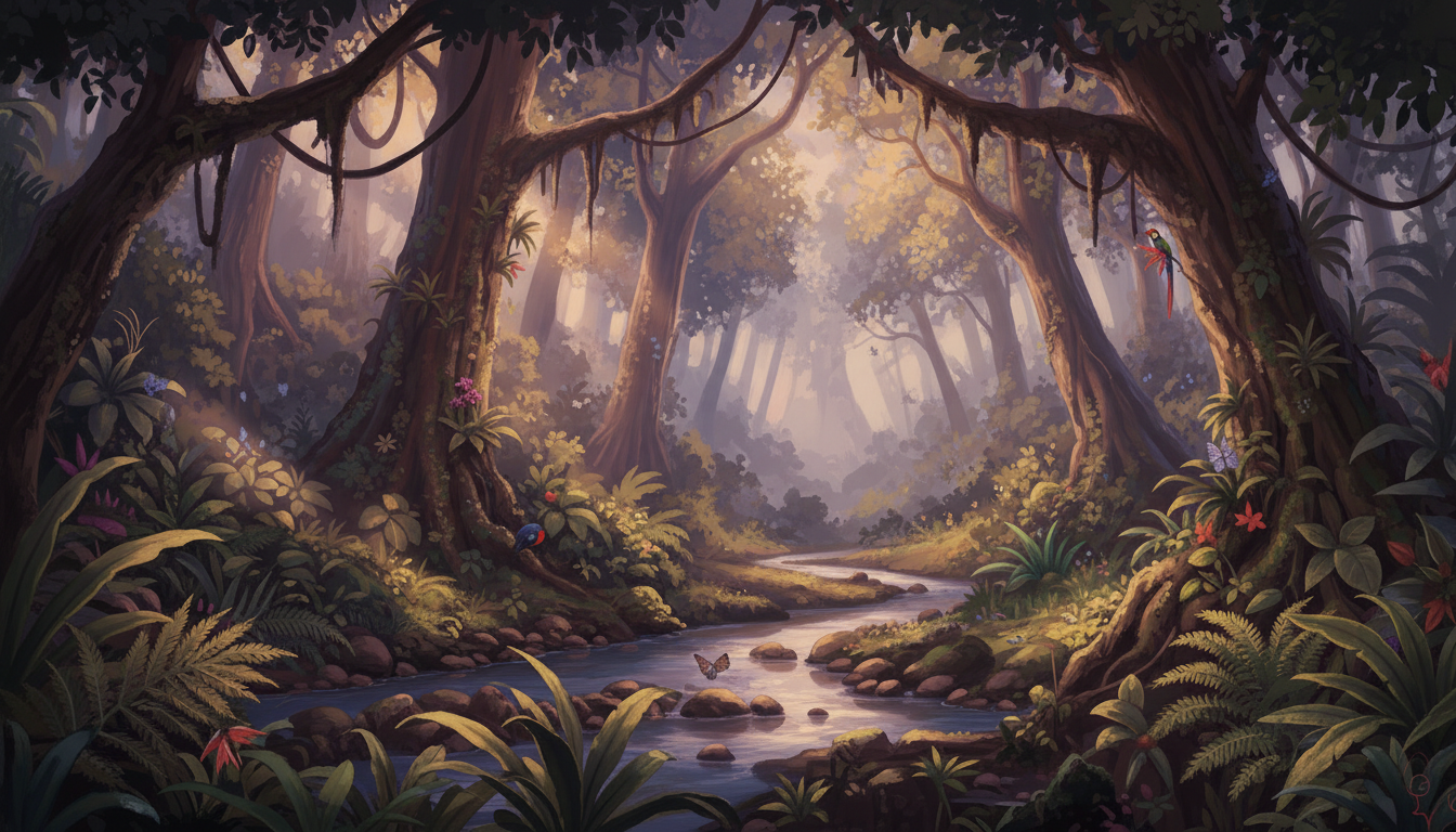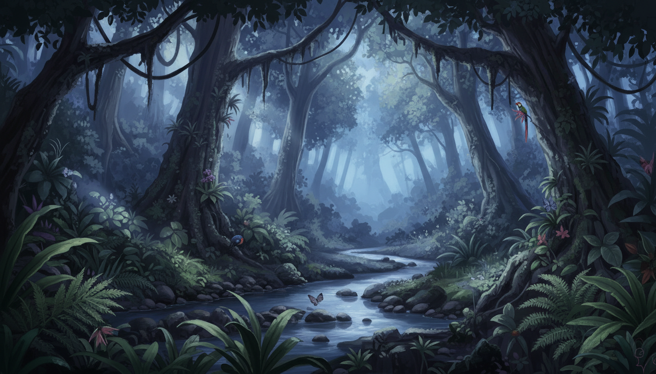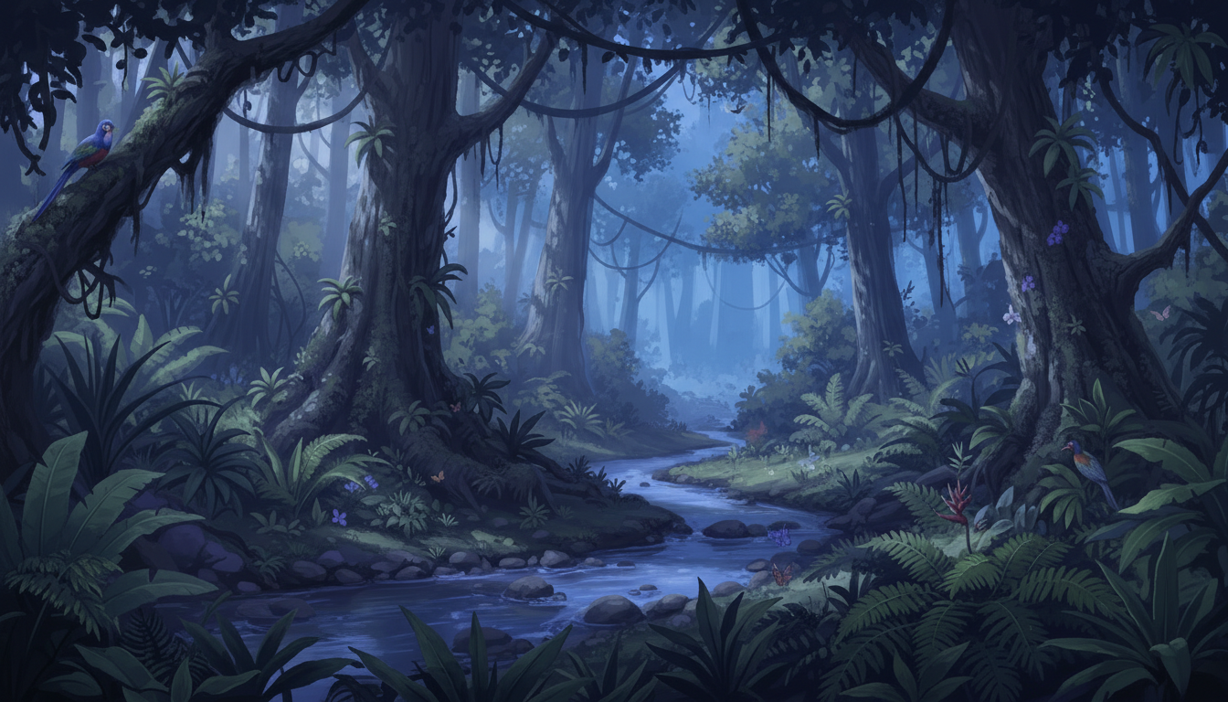 豊かな熱帯雨林の中を流れる清流と色鮮やかな野鳥を描いた幻想的なジャングル背景素材です。