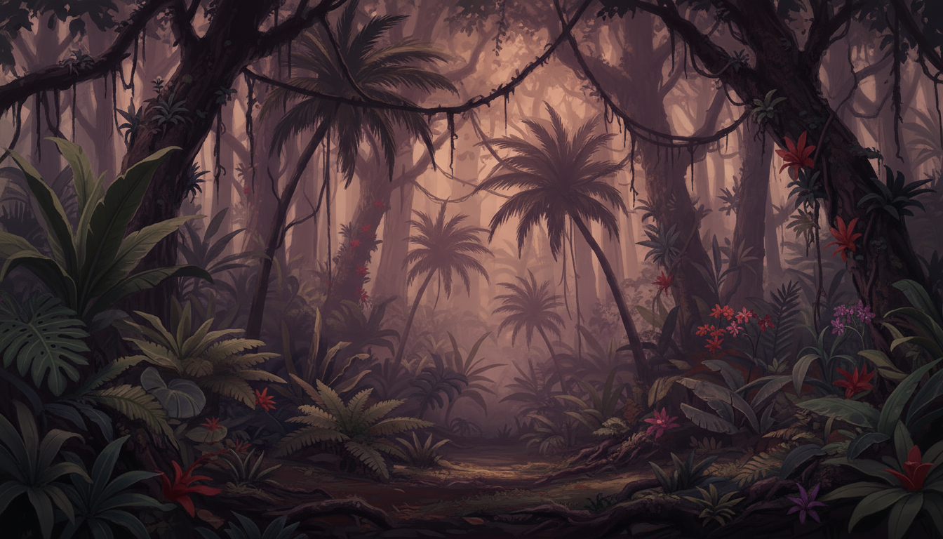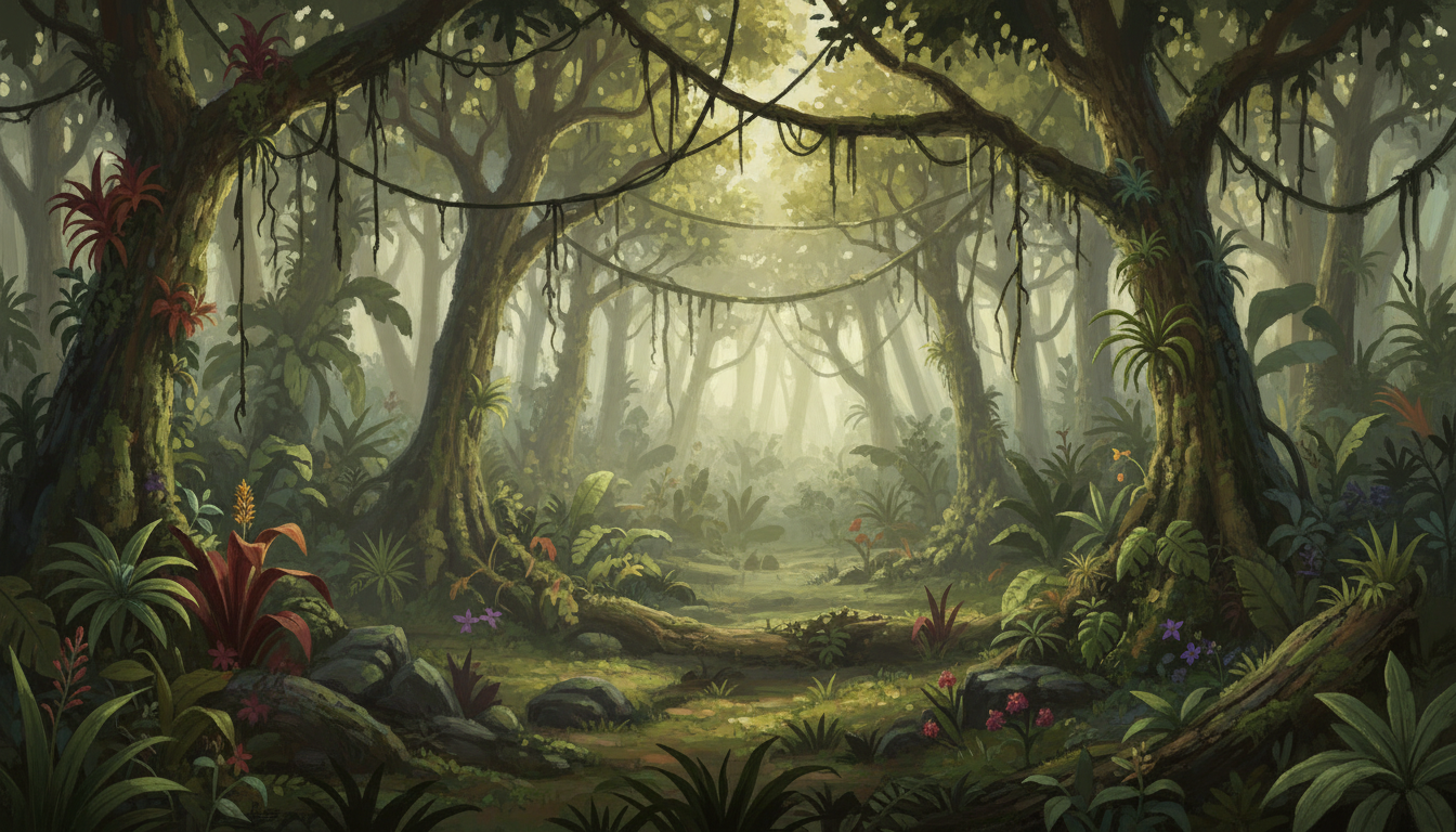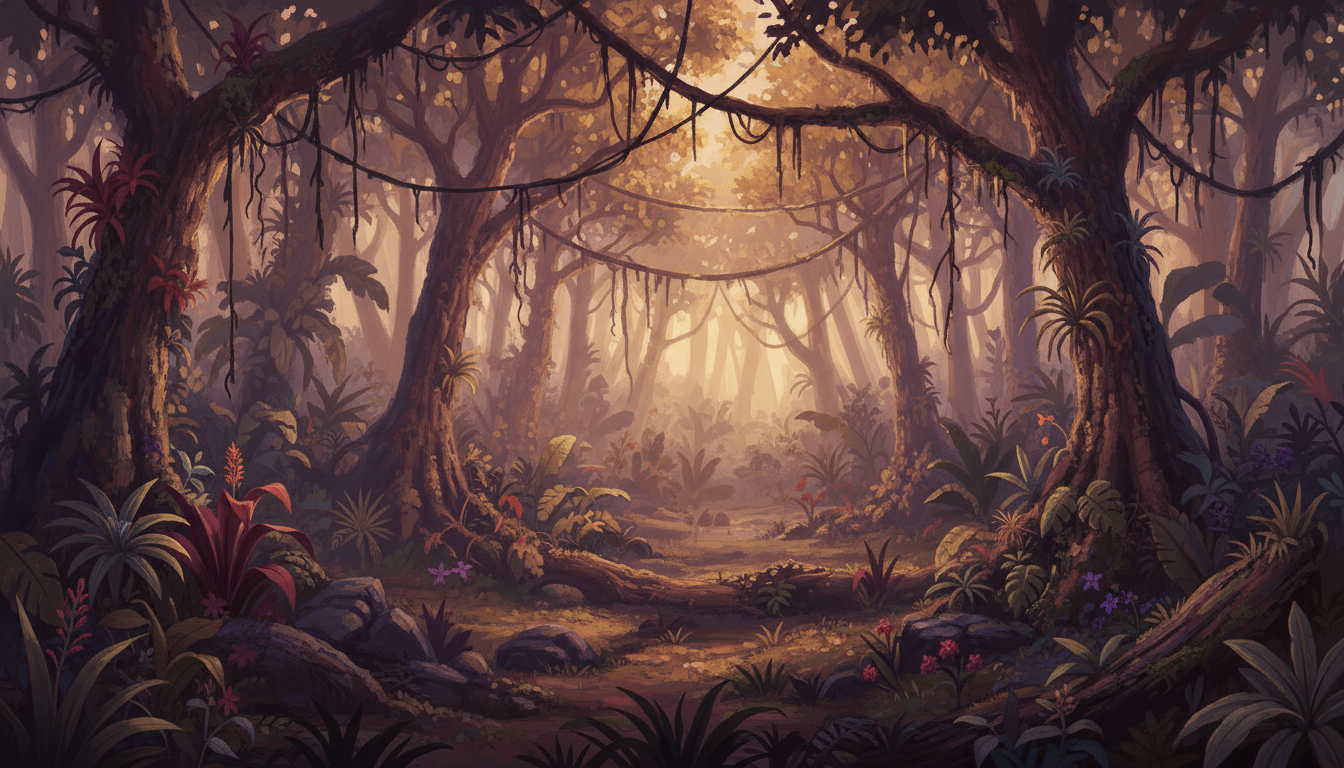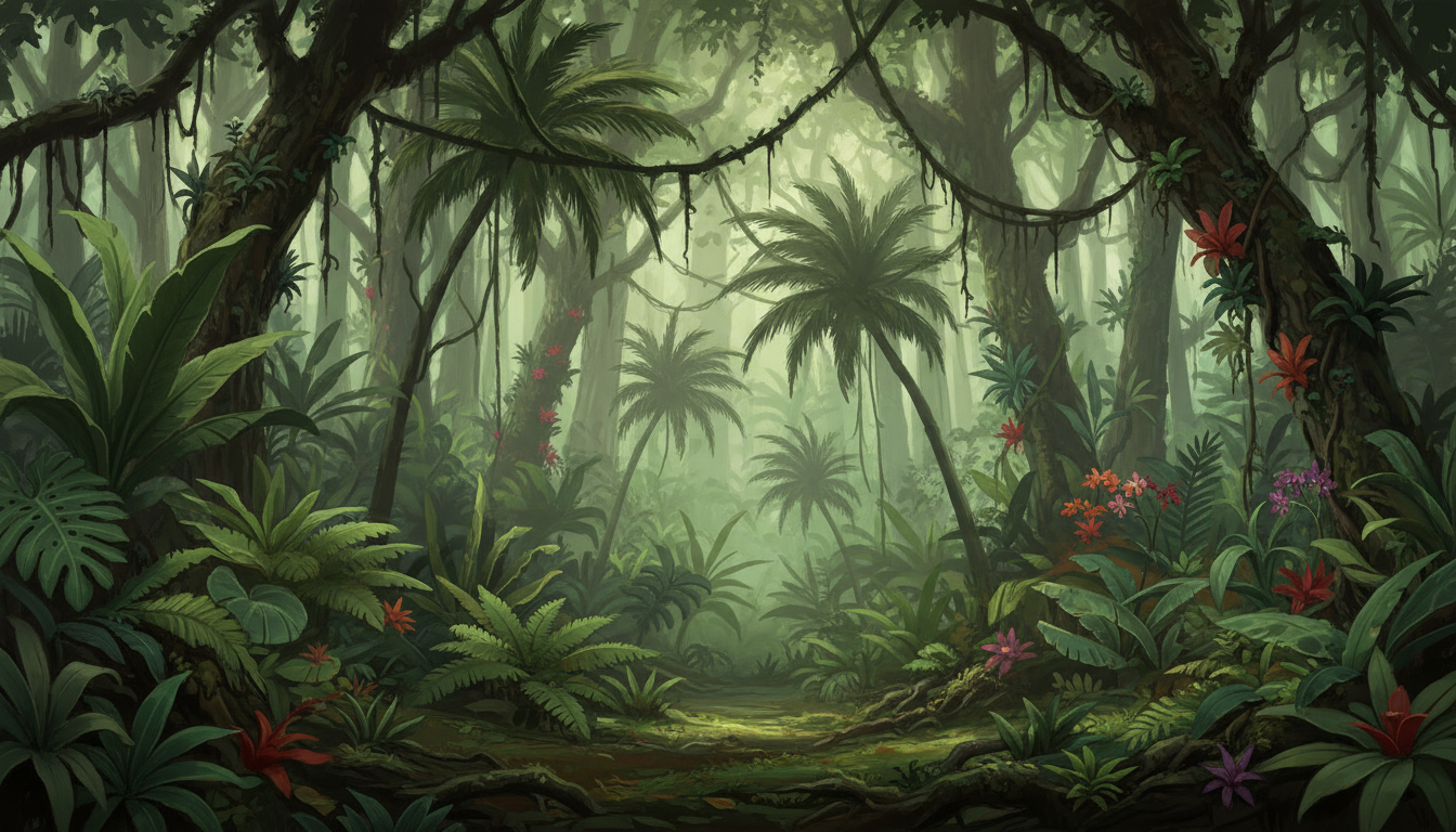 巨大な樹木と豊富な草花が生い茂る原生林を描いた没入感のある背景イラストです。