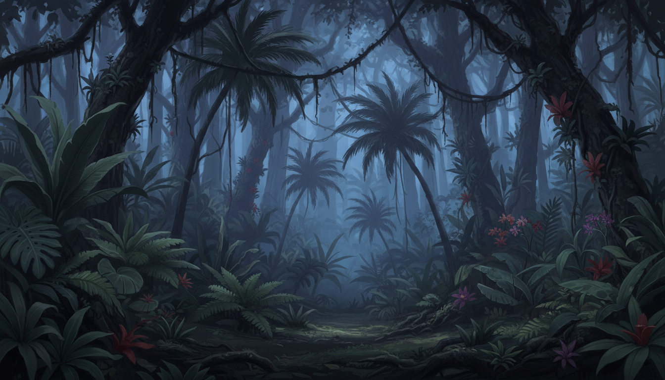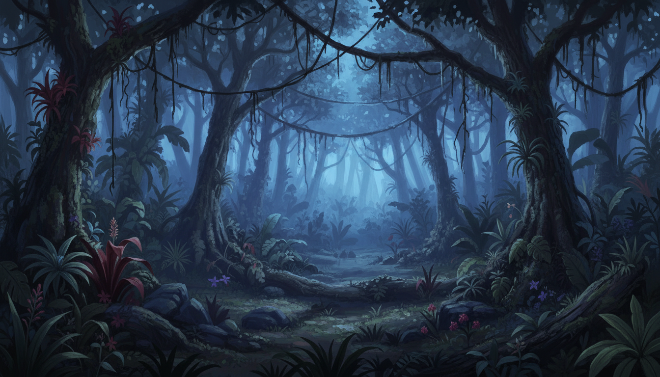青く静まり返る夜の熱帯雨林を表現した神秘的なジャングル背景イラスト素材です。