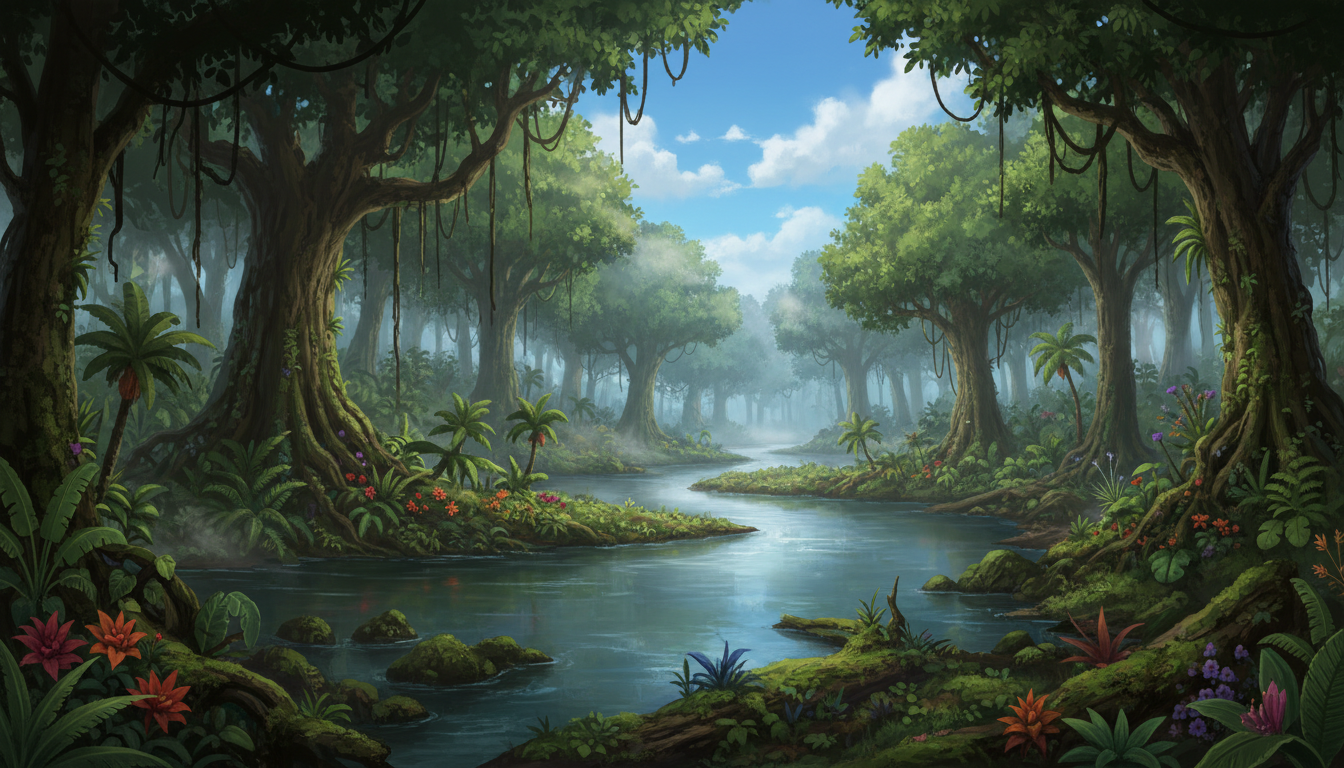 根を張る木々と穏やかな水面が特徴的な熱帯ジャングルの背景イラスト素材です。