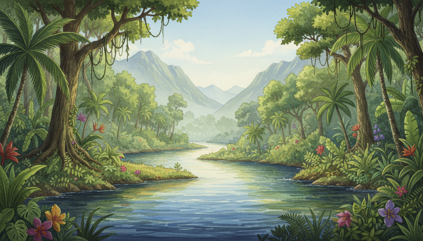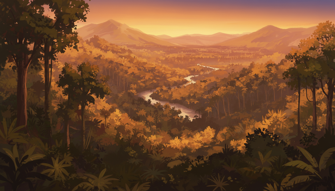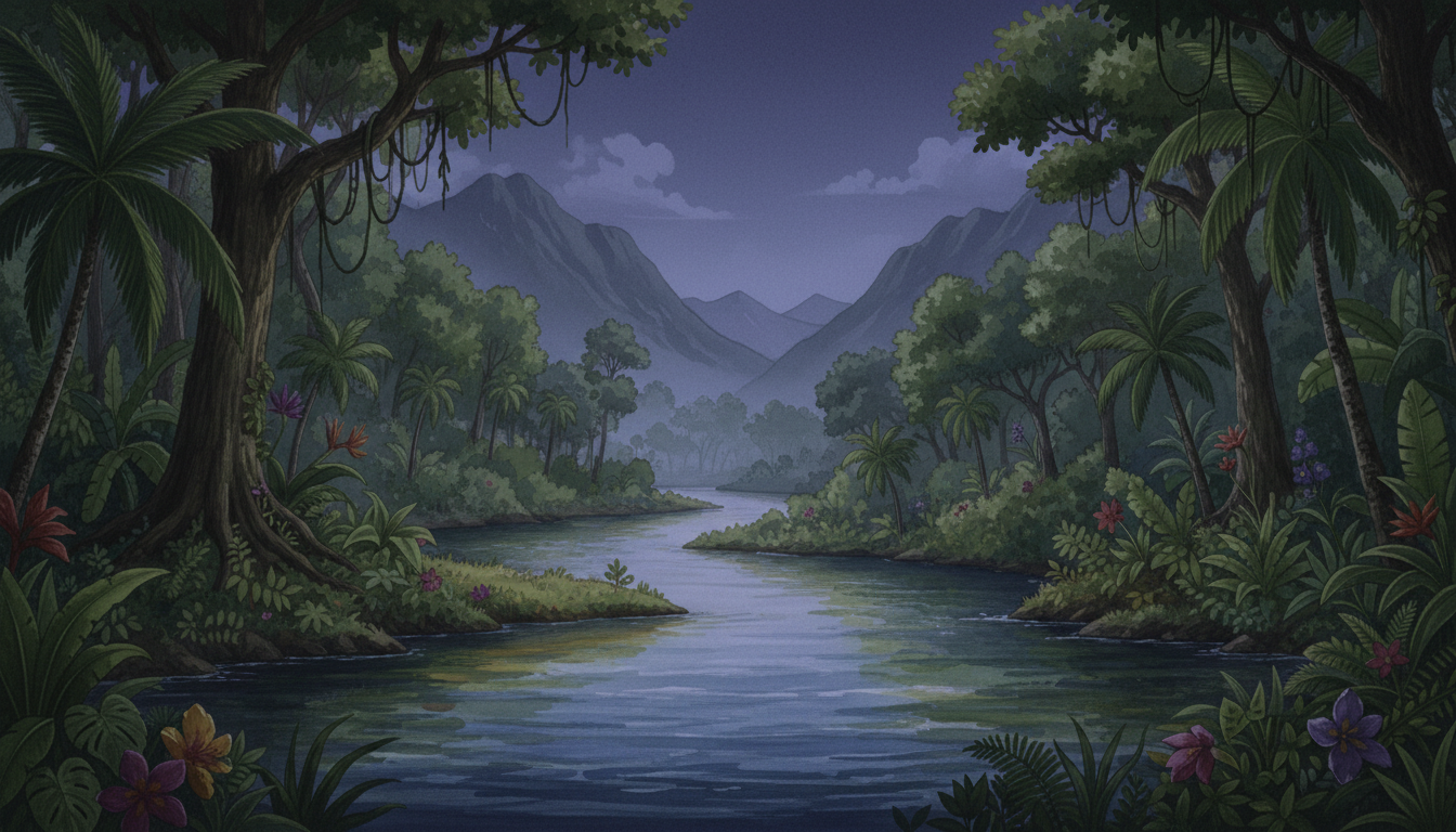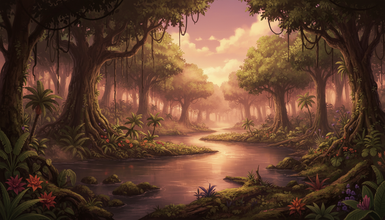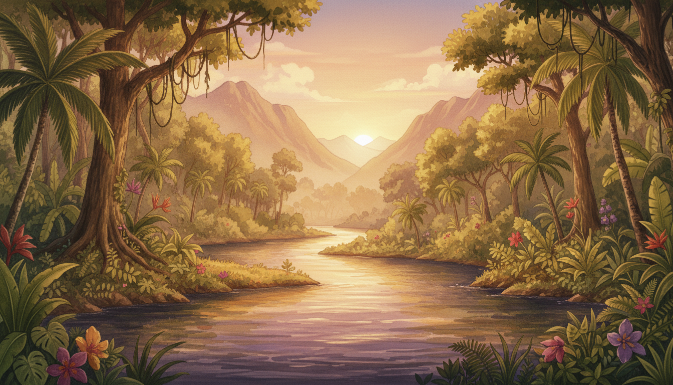 暖かな夕暮れの光に包まれた熱帯雨林と穏やかな小川を描いた背景イラストです。