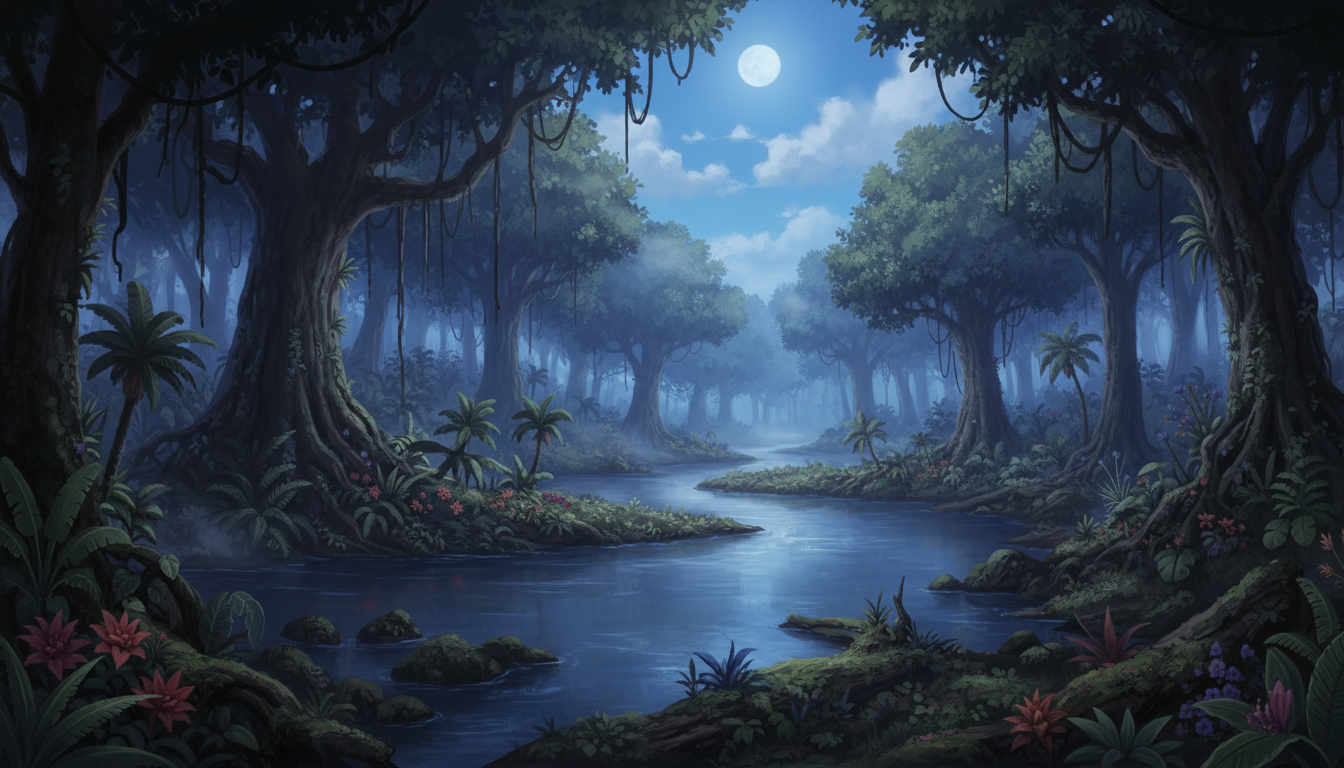 月明かりに照らされた深い森と静かな川辺を描いた夜のジャングル背景素材です。
