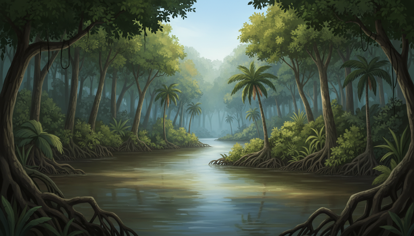 マングローブが広がるジャングルの水辺|背景イラスト素材