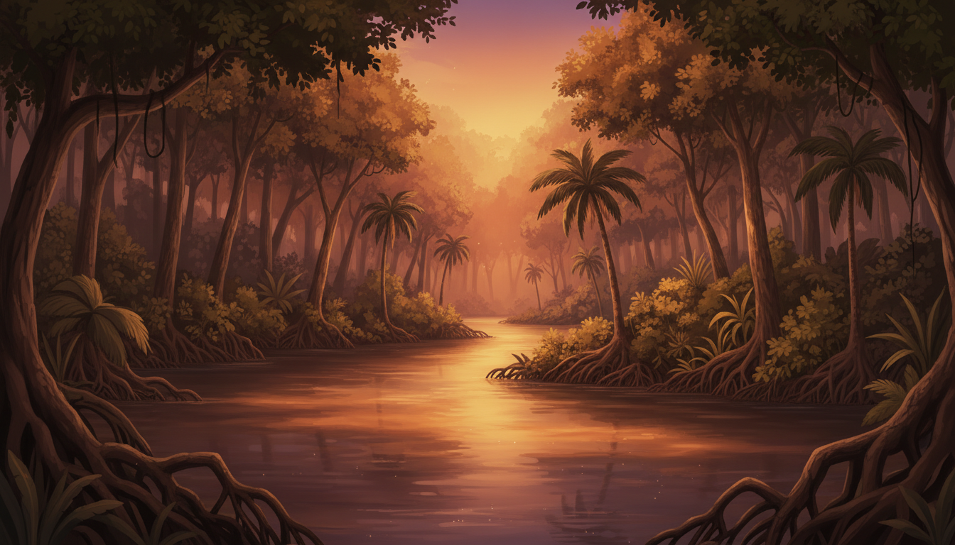 温かみのある夕景に包まれたマングローブ林と川を描いた背景イラスト素材です。
