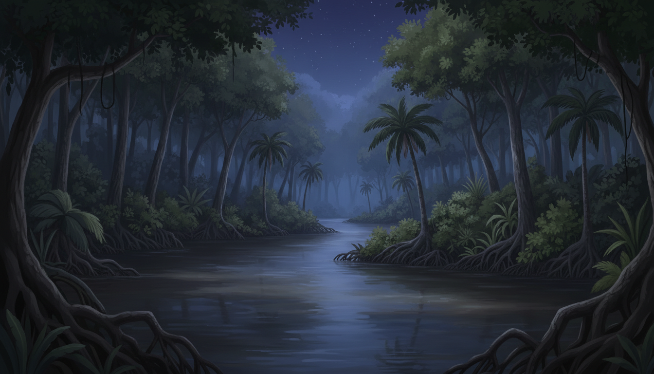 夜のジャングルと静かな川辺|ナイトシーン背景イラスト素材