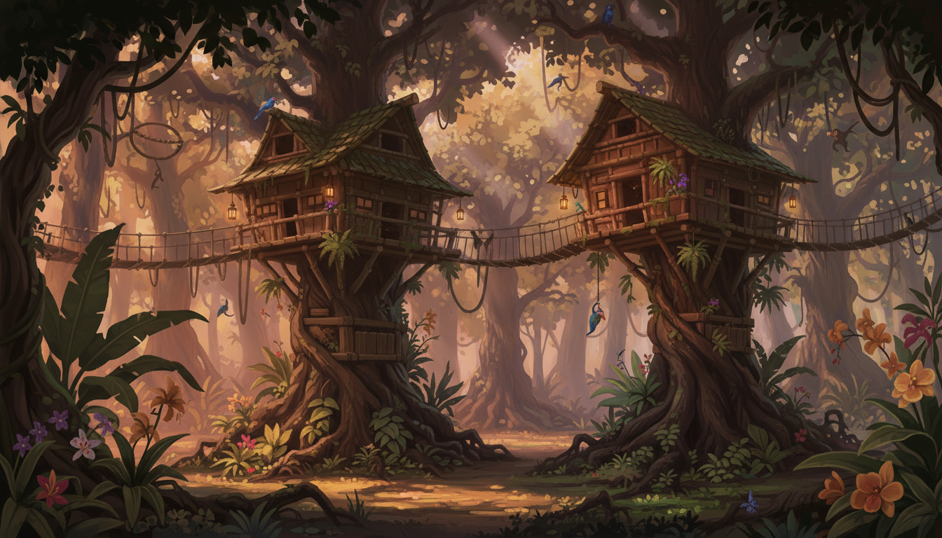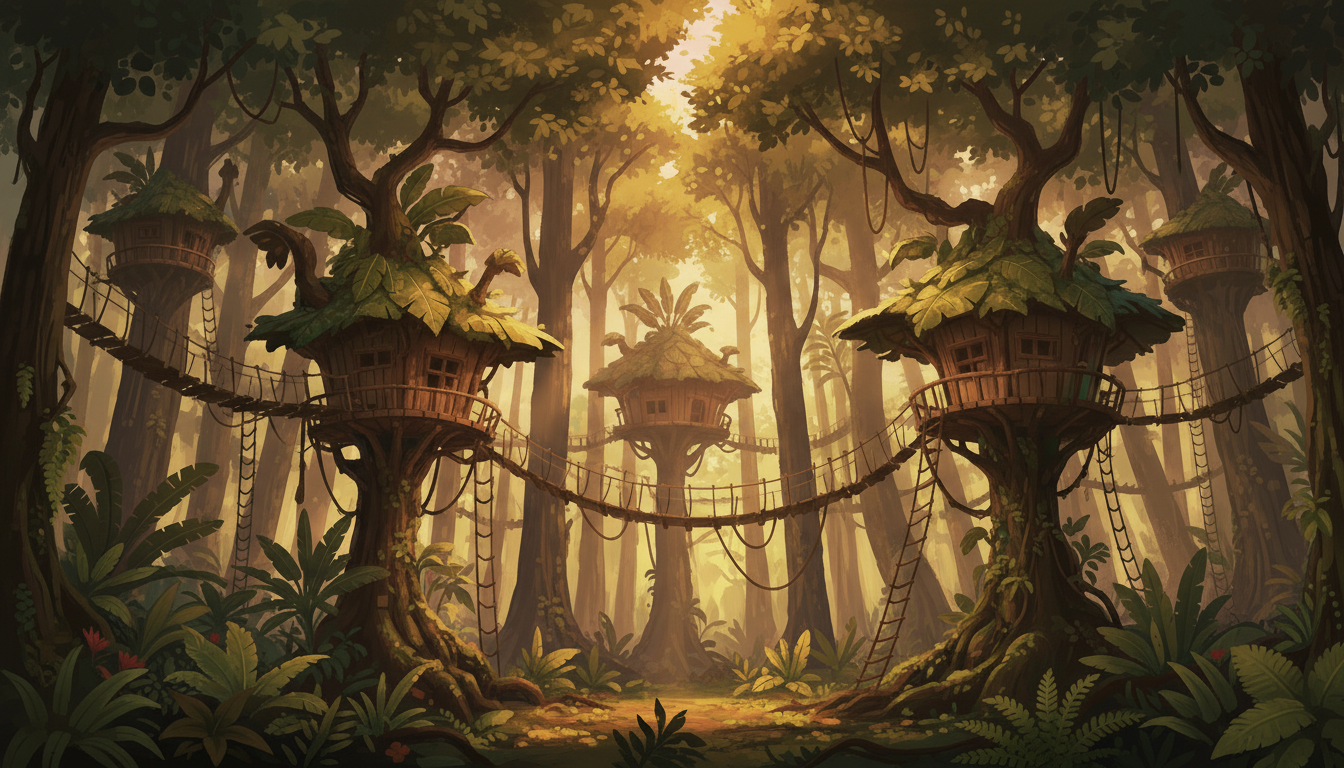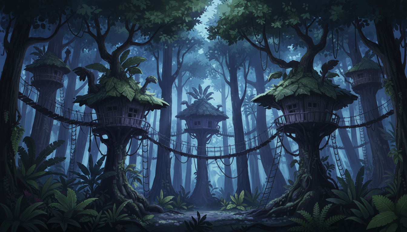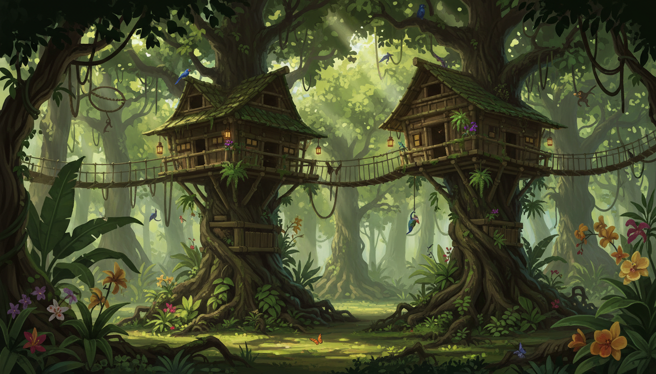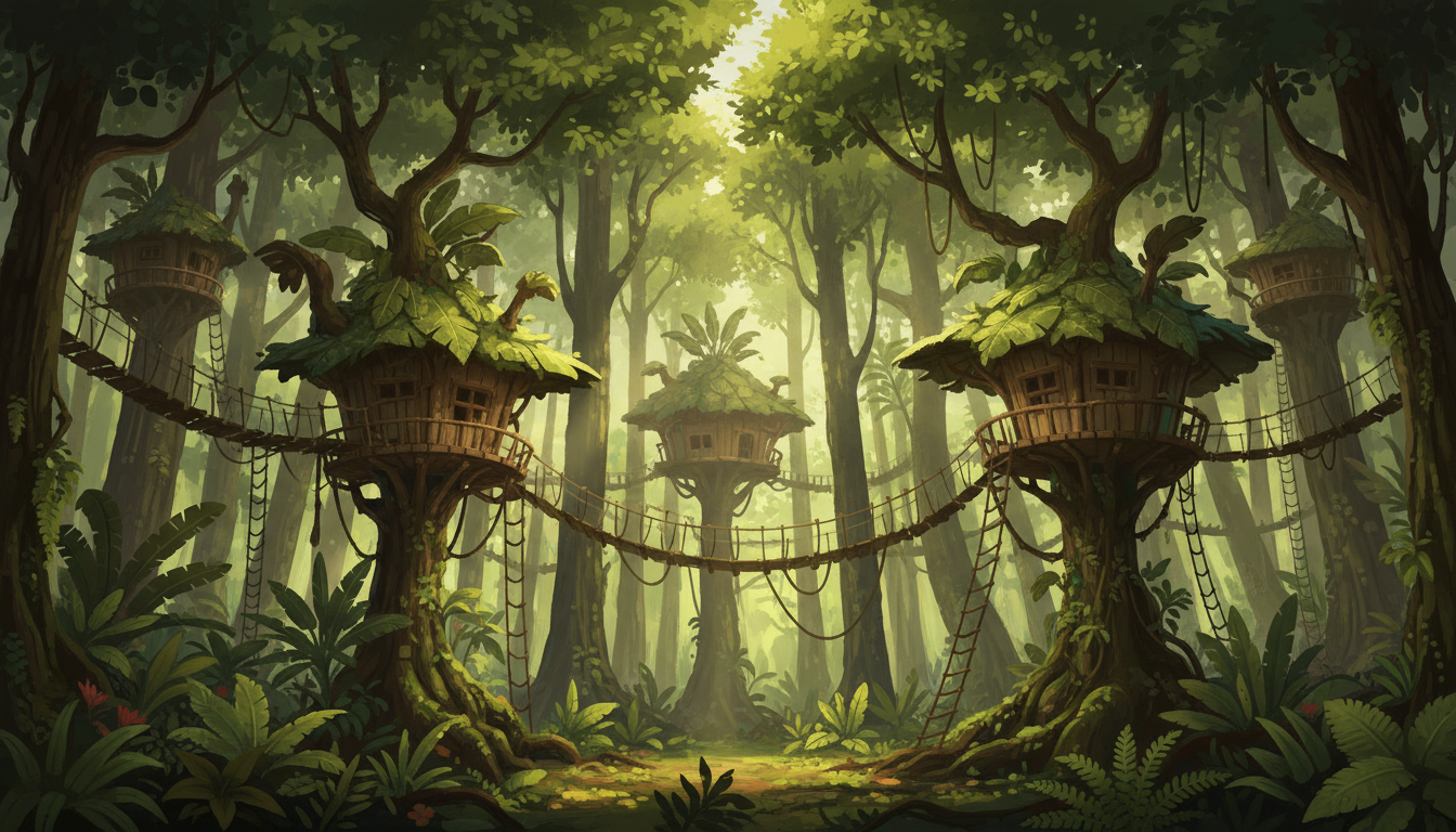 木々の間に並ぶツリーハウスと吊り橋が印象的な、冒険シーンに最適なジャングル背景イラスト素材です。