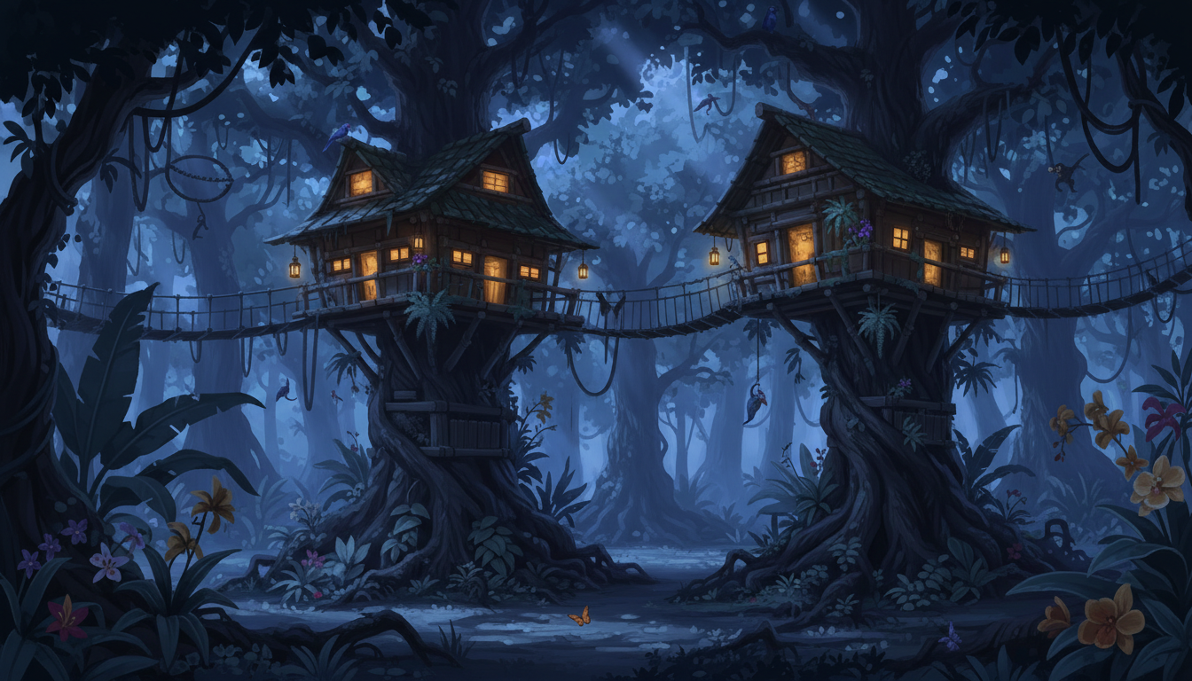 夜のツリーハウスと灯り|ナイトシーンのジャングル背景イラスト素材